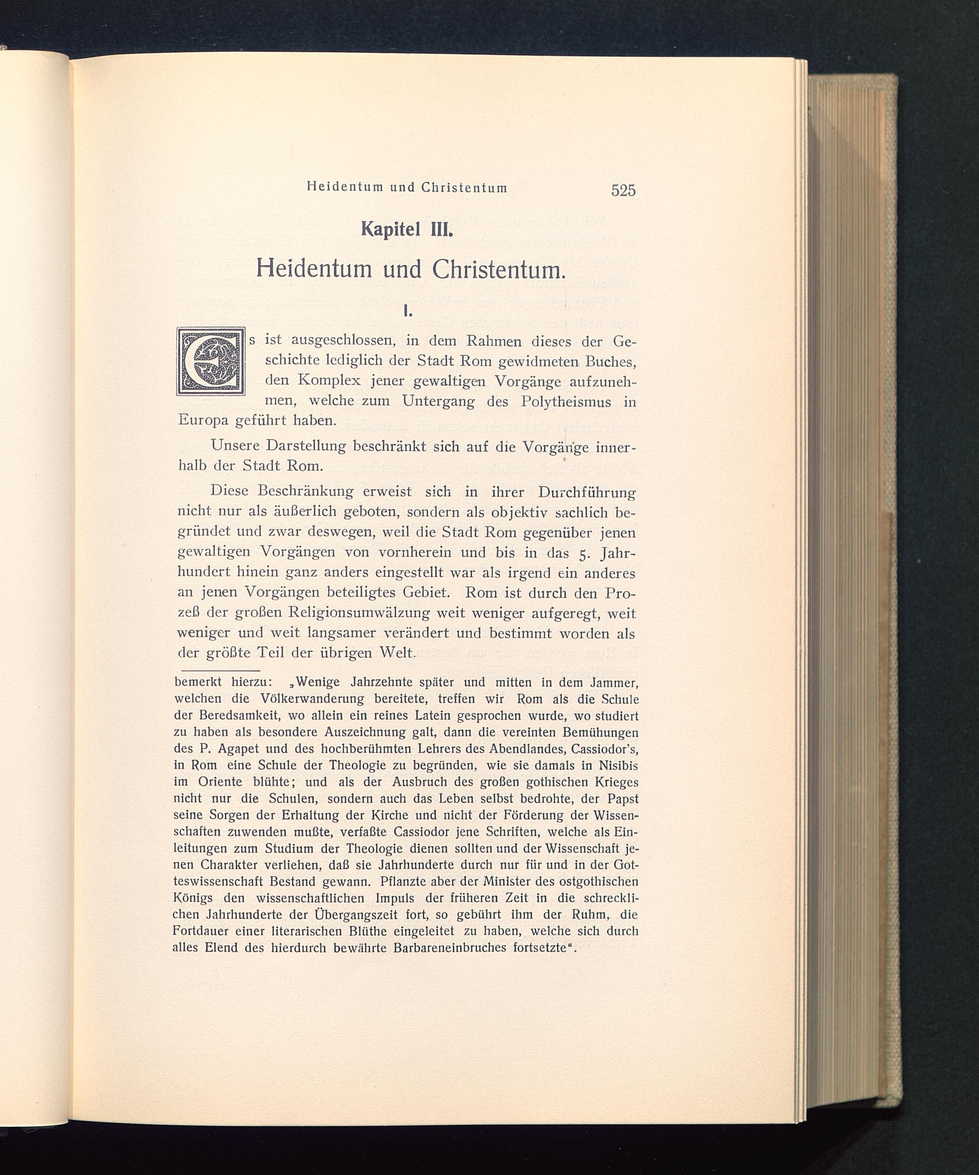 bemerkt hierzu: .Wenige Jahrzehnte später und mitten in dem Jammer,welchen die Völkerwanderung bereitete, treffen wir Rom als die Schuleder Beredsamkeit, wo allein ein reines Latein gesprochen wurde, wo studiertzu haben als besondere Auszeichnung galt, dann die vereinten Bemühungendes P. Agapet und des hochberühmten Lehrers des Abendlandes, Cassiodor’s ,in Rom eine Schule der Theologie zu begründen, wie sie damals in Nisibisim Oriente blühte; und als der Ausbruch des großen gothischen Kriegesnicht nur die Schulen, sondern auch das Leben selbst bedrohte, der Papstseine Sorgen der Erhaltung der Kirche und nicht der Förderung der Wissen-schaften zuwenden mußte, verfaßte Cassiodor jene Schriften, welche als Ein-leitungen zum Studium der Theologie dienen sollten und der Wissenschaft je-nen Charakter verliehen, daß sie Jahrhunderte durch nur für und in der Got-teswissenschaft Bestand gewann. Pflanzte aber der Minister des ostgothischenKönigs den wissenschaftlichen Impuls der früheren Zeit in die schreckli-chen Jahrhunderte der Übergangszeit fort, so gebührt ihm der Ruhm, dieFortdauer einer literarischen Blüthe eingeleitet zu haben, welche sich durchalles Elend des hierdurch bewährte Barbareneinbruches fortsetzte“.