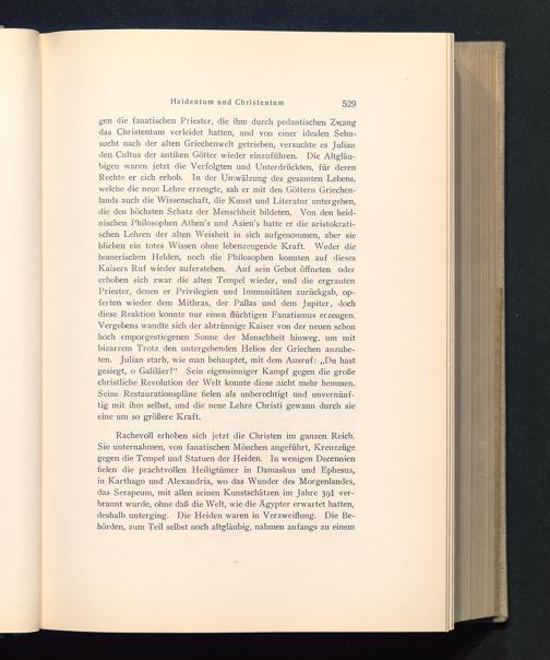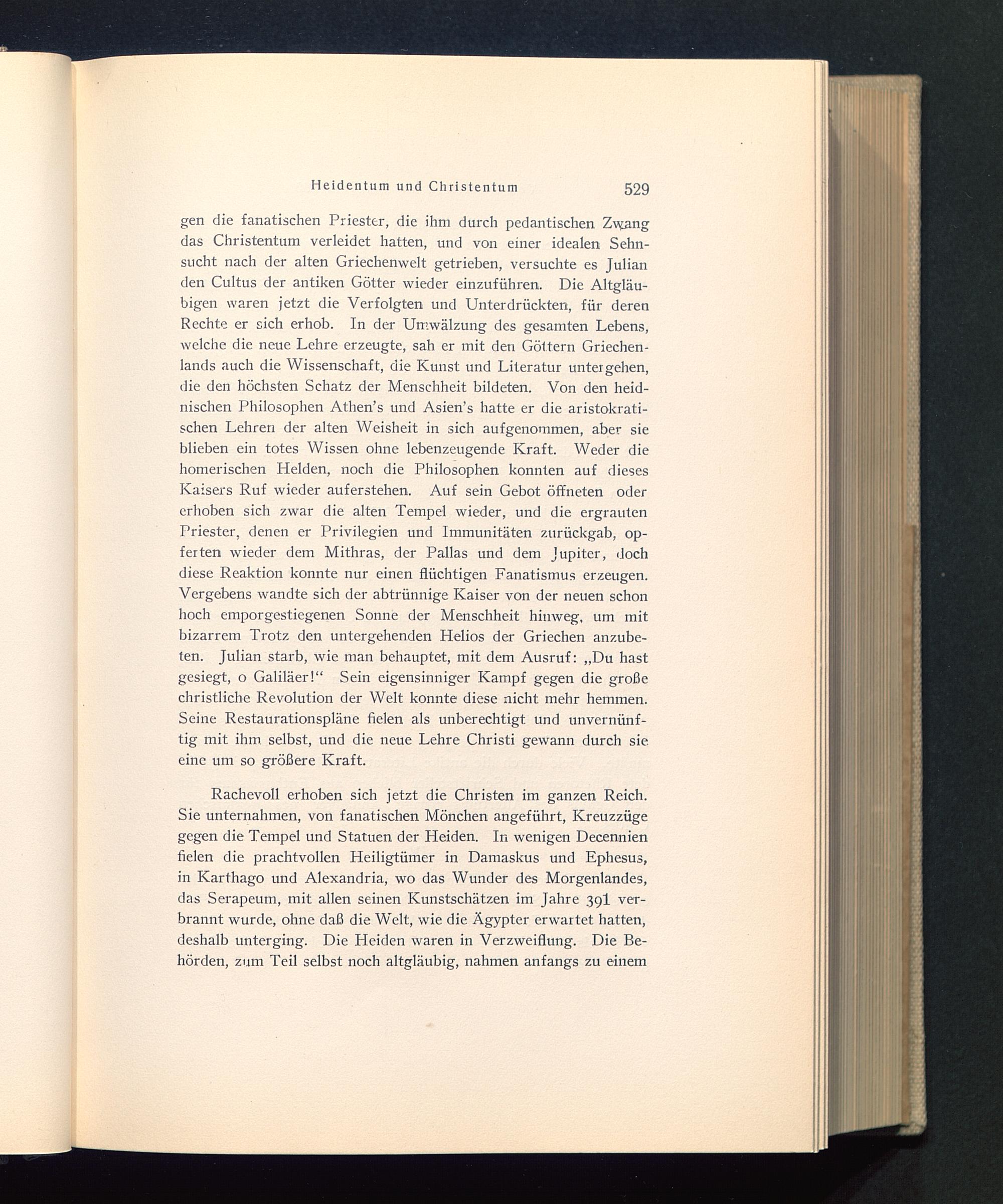 Rachevoll erhoben sich jetzt die Christen im ganzen Reich.Sie unternahmen, von fanatischen Mönchen angeführt, Kreuzzügegegen die Tempel und Statuen der Heiden. In wenigen Decennienfielen die prachtvollen Heiligtümer in Damaskus und Ephesus ,in Karthago und Alexandria , wo das Wunder des Morgenlandes,das Serapeum, mit allen seinen Kunstschätzen im Jahre 39I ver-brannt wurde, ohne daß die Welt, wie die Ägypter erwartet hatten,deshalb unterging. Die Heiden waren in Verzweiflung. Die Be-hörden, zum Teil selbst noch altgläubig, nahmen anfangs zu einem