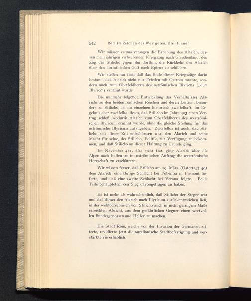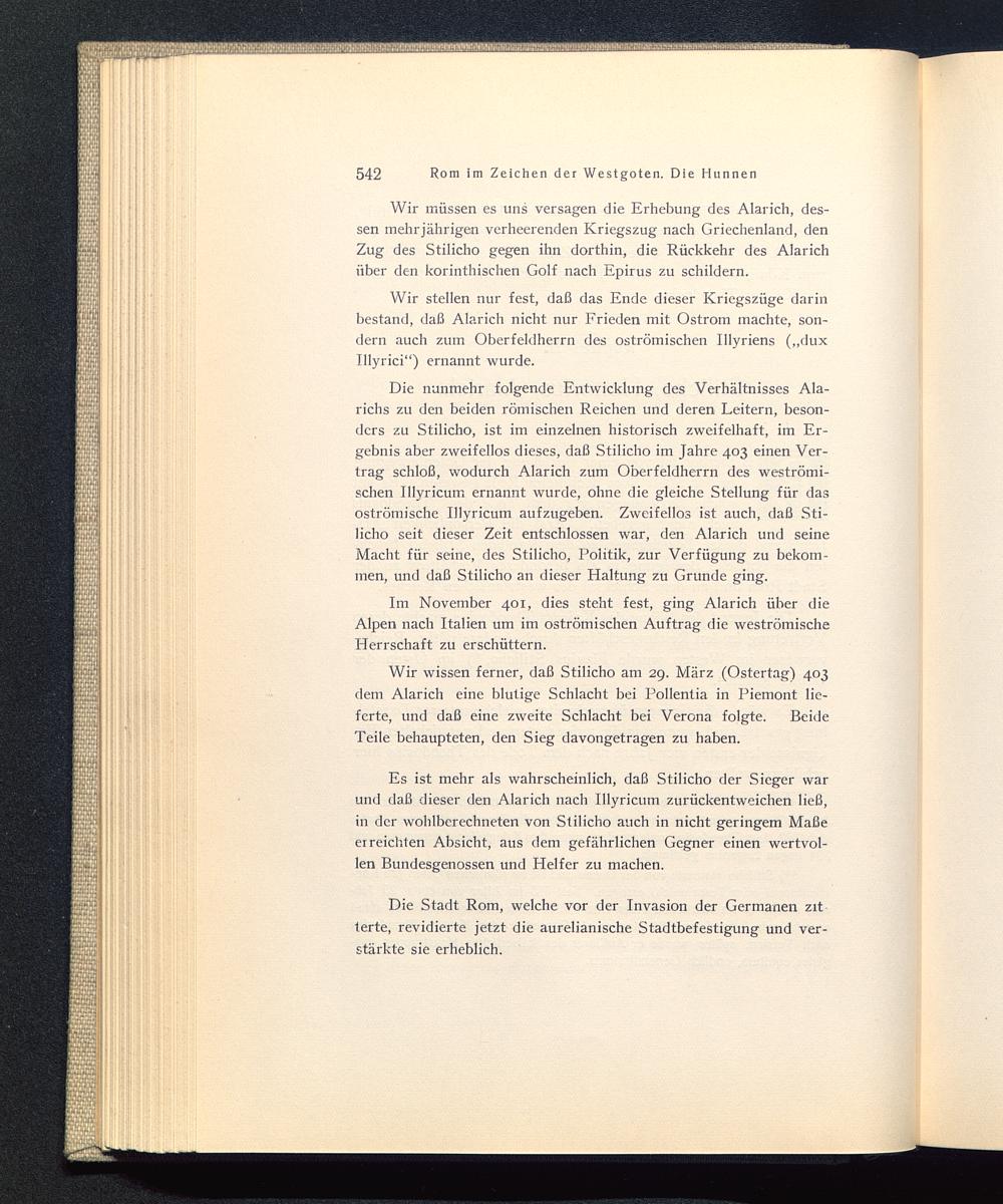Die nunmehr folgende Entwicklung des Verhältnisses Ala-richs zu den beiden römischen Reichen und deren Leitern, beson-ders zu Stilicho , ist im einzelnen historisch zweifelhaft, im Er-gebnis aber zweifellos dieses, daß Stilicho im Jahre 403 einen Ver-trag schloß, wodurch Alarich zum Oberfeldherrn des weströmi-schen Illyricum ernannt wurde, ohne die gleiche Stellung für dasoströmische Illyricum aufzugeben. Zweifellos ist auch, daß Sti-licho seit dieser Zeit entschlossen war, den Alarich und seineMacht für seine, des Stilicho , Politik, zur Verfügung zu bekom-men, und daß Stilicho an dieser Haltung zu Grunde ging.