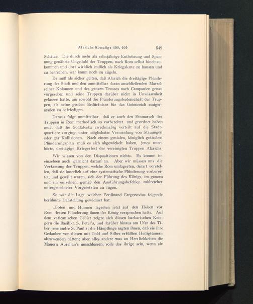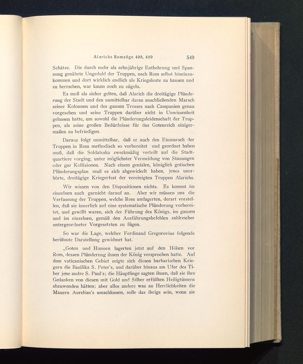 Daraus folgt unmittelbar, daß er auch den Einmarsch derTruppen in Rom methodisch so vorbereitet und geordnet habenmuß, daß die Soldateska zweckmäßig verteilt auf die Stadt-quartiere vorging, unter möglichster Vermeidung von Stauungenoder gar Kollisionen. Nach einem genialen, königlich gotischenPlünderungsplan muß es sich abgewickelt haben, jenes uner-hörte, dreitägige Kriegerfest der vereinigten Truppen Alarichs.