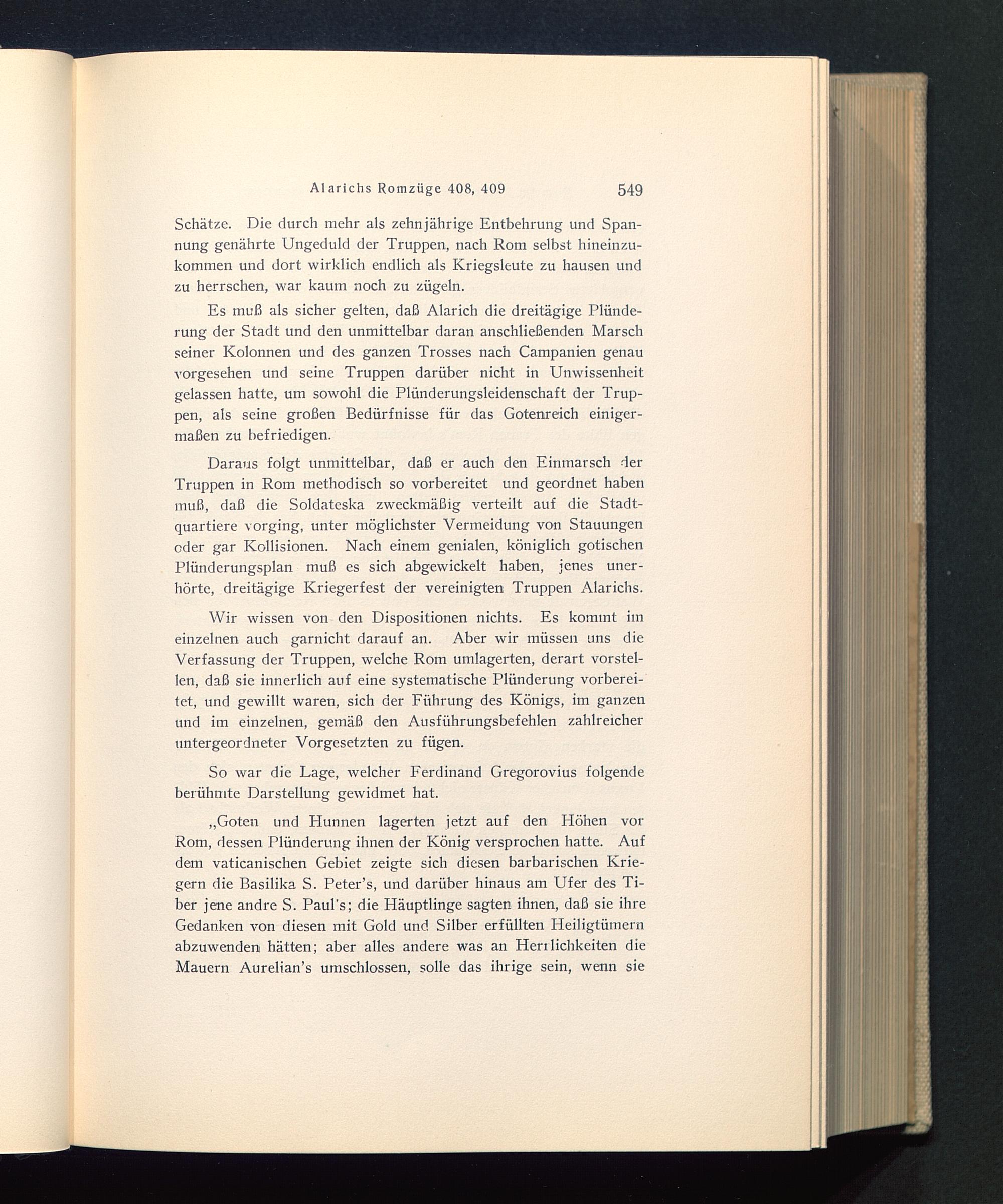 „Goten und Hunnen lagerten jetzt auf den Höhen vorRom , dessen Plünderung ihnen der König versprochen hatte. Aufdem vaticanischen Gebiet, zeigte sich diesen barbarischen Krie-gern die Basilika S. Peter’s, und darüber hinaus am Ufer des Ti-ber jene andre S. Paul’s; die Häuptlinge sagten ihnen, daß sie ihreGedanken von diesen mit Gold und Silber erfüllten Heiligtümernabzuwenden hätten; aber alles andere was an Herilichkeiten dieMauern Aurelian’s umschlossen, solle das ihrige sein, wenn sie