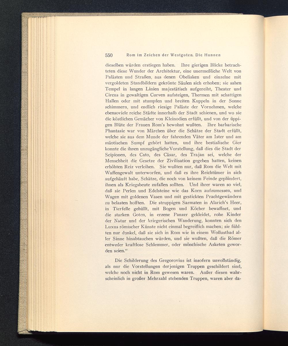 dieselben würden erstiegen haben. Ihre gierigen Blicke betrach-teten diese Wunder der Architektur, eine unermeßliche Welt vonPalästen und Straßen, aus denen Obelisken und einzelne mitvergoldeten Standbildern gekrönte Säulen sich erhoben; sie sahenTempel in langen Linien majestätisch aufgereiht, Theater undCircus in gewaltigen Curven aufsteigen, Thermen mit schattigenHallen oder mit stumpfen und breiten Kuppeln in der Sonneschimmern, und endlich riesige Paläste der Vornehmen, welcheebensoviele reiche Städte innerhalb der Stadt schienen, und wo siedie köstlichen Gemächer von Kleinodien erfüllt, und von der üppi-gen Blüte der Frauen Rom’s bewohnt wußten. Ihre barbarischePhantasie war von Märchen über die Schätze der Stadt erfüllt,welche sie aus dem Munde der fahrenden Väter am Ister und ammäotischen Sumpf gehört hatten, und ihre bestialische Gierkonnte die ihnen unzugängliche Vorstellung, daß dies die Stadt derScipionen, des Cato, des Cäsar, des Trajan sei, welche derMenschheit die Gesetze der Zivilisation gegeben hatten, keinenerhöhten Reiz verleihen. Sie wußten nur, daß Rom die Welt mitWaffengewalt unterworfen, und daß es ihre Reichtümer in sichaufgehäuft habe, Schätze, die noch von keinem Feinde geplündert,ihnen als Kriegsbeute zufallen sollten. Und ihrer waren so viel,daß sie Perlen und Edelsteine wie das Korn aufzumesseu, undWagen mit goldenen Vasen und mit gestickten Prachtgewändernzu belasten hofften. Die struppigen Sarmaten in Alarich’s Heer,in Tierfelle gehüllt, mit Bogen und Köcher bewaffnet, unddie starken Goten, in erzene Panzer gekleidet, rohe Kinderder Natur und der kriegerischen Wanderung, konnten sich denLuxus römischer Künste nicht einmal begreiflich machen; sie fühl-ten nur dunkel, daß sie sich in Rom wie in einem Wollustbad al-ler Sinne hinabtauchen würden, und sie wußten, daß die Römerentweder kraftlose Schlemmer, oder mönchische Asketen gewor-den seien.“