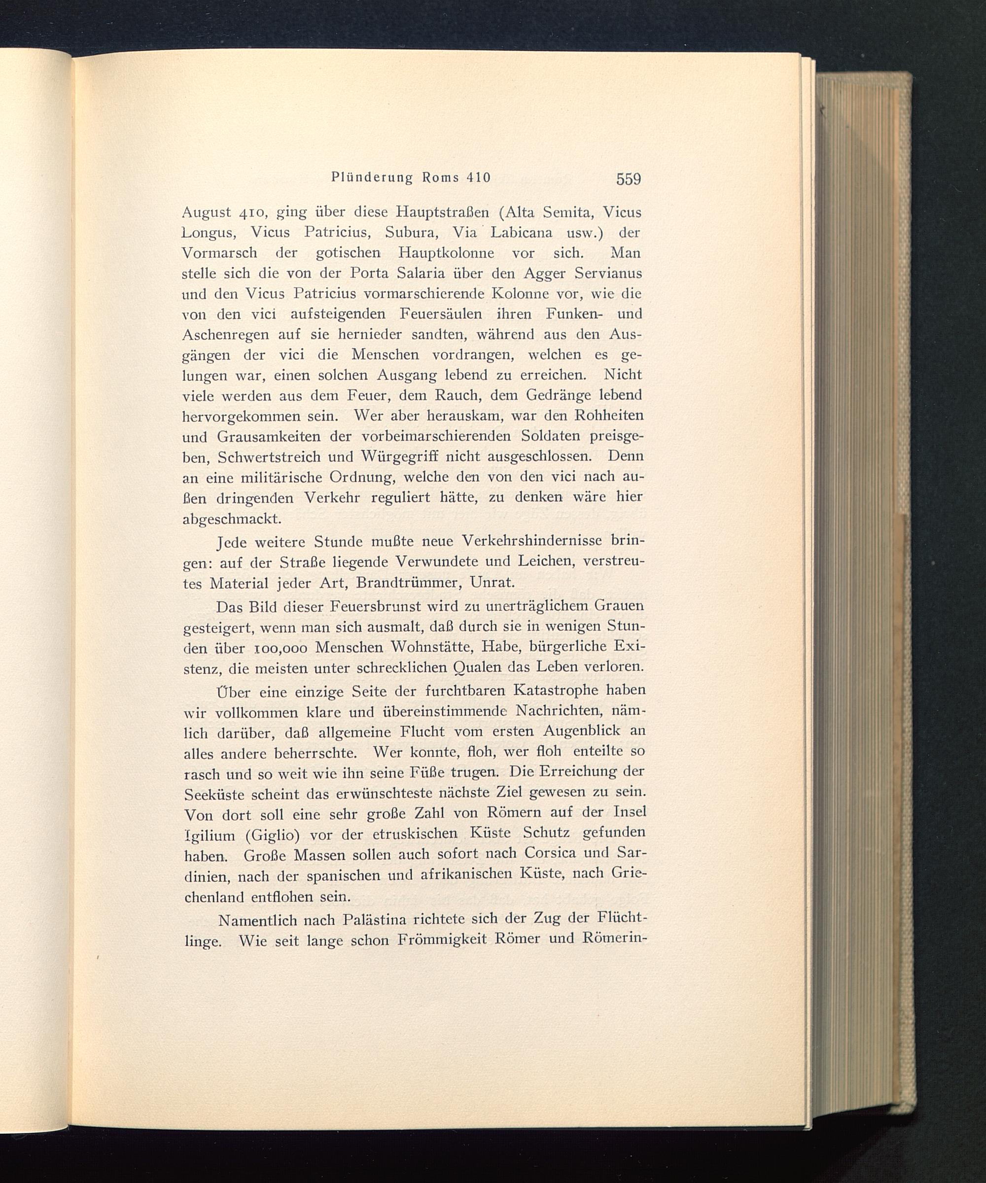 August 410, ging über diese Hauptstraßen (Alta Semita, VicusLongus, Vicus Patricius, Subura , Via Labicana usw.) derVormarsch der gotischen Hauptkolonne vor sich. Manstelle sich die von der Porta Salaria über den Agger Servianusund den Vicus Patricius vormarschicrende Kolonne vor, wie dievon den vici auf steigenden Feuersäulen ihren Funken- undAschenregen auf sie hernieder sandten, während aus den Aus-gängen der vici die Menschen vordrangen, welchen es ge-lungen war, einen solchen Ausgang lebend zu erreichen. Nichtviele werden aus dem Feuer, dem Rauch, dem Gedränge lebendhervorgekommen sein. Wer aber herauskam, war den Rohheitenund Grausamkeiten der vorbeimarschierenden Soldaten preisge-ben, Schwertstreich und Würgegriff nicht ausgeschlossen. Dennan eine militärische Ordnung, welche den von den vici nach au-ßen dringenden Verkehr reguliert hätte, zu denken wäre hierabgeschmackt.