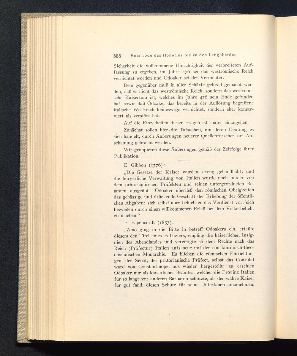 „Zeno ging in die Bitte in betreff Odoakers ein, erteiltediesem den Titel eines Patriziers, empfing die kaiserlichen Insig-nien des Abendlandes und vereinigte so dem Rechte nach dasReich (Präfectur) Italien aufs neue mit der constantinisch-theo-dosianischen Monarchie. Es blieben die römischen Einrichtun-gen, der Senat, der prätorianische Präfect, selbst das Consulatward von Constantinopel aus wieder hergestellt; es erschienOdoaker nur als kaiserlicher Beamter, welcher die Provinz Italien für so lange vor anderen Barbaren schützte, als der wahre Kaiserfür gut fand, diesen Schutz für seine Untertanen anzunehmen.