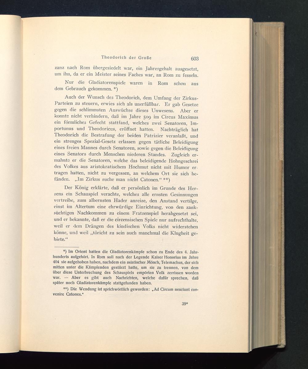 Auch der Wunsch des Theodorich, dem Umfang der Zirkus-Parteien zu steuern, erwies sich als unerfüllbar. Er gab Gesetzegegen die schlimmsten Auswüchse dieses Unwesens. Aber erkonnte nicht verhindern, daß im Jahre 509 im Circus Maximus ein förmliches Gefecht stattfand, welches zwei Senatoren, Im-portunus und Theodoricus, eröffnet hatten. Nachträglich hatTheodorich die Bestrafung der beiden Patrizier veranlaßt, undein strenges Spezial-Gesetz erlassen gegen tätliche Beleidigungeines freien Mannes durch Senatoren, sowie gegen die Beleidigungeines Senators durch Menschen niederen Standes. Zugleich er-mahnte er die Senatoren, welche das beleidigende Hohngeschreides Volkes aus aristokratischem Hochmut nicht mit Humor er-tragen hatten, nicht zu vergessen, an welchem Ort sie sich be-fänden. „Im Zirkus suche man nicht Catonen.“ **)