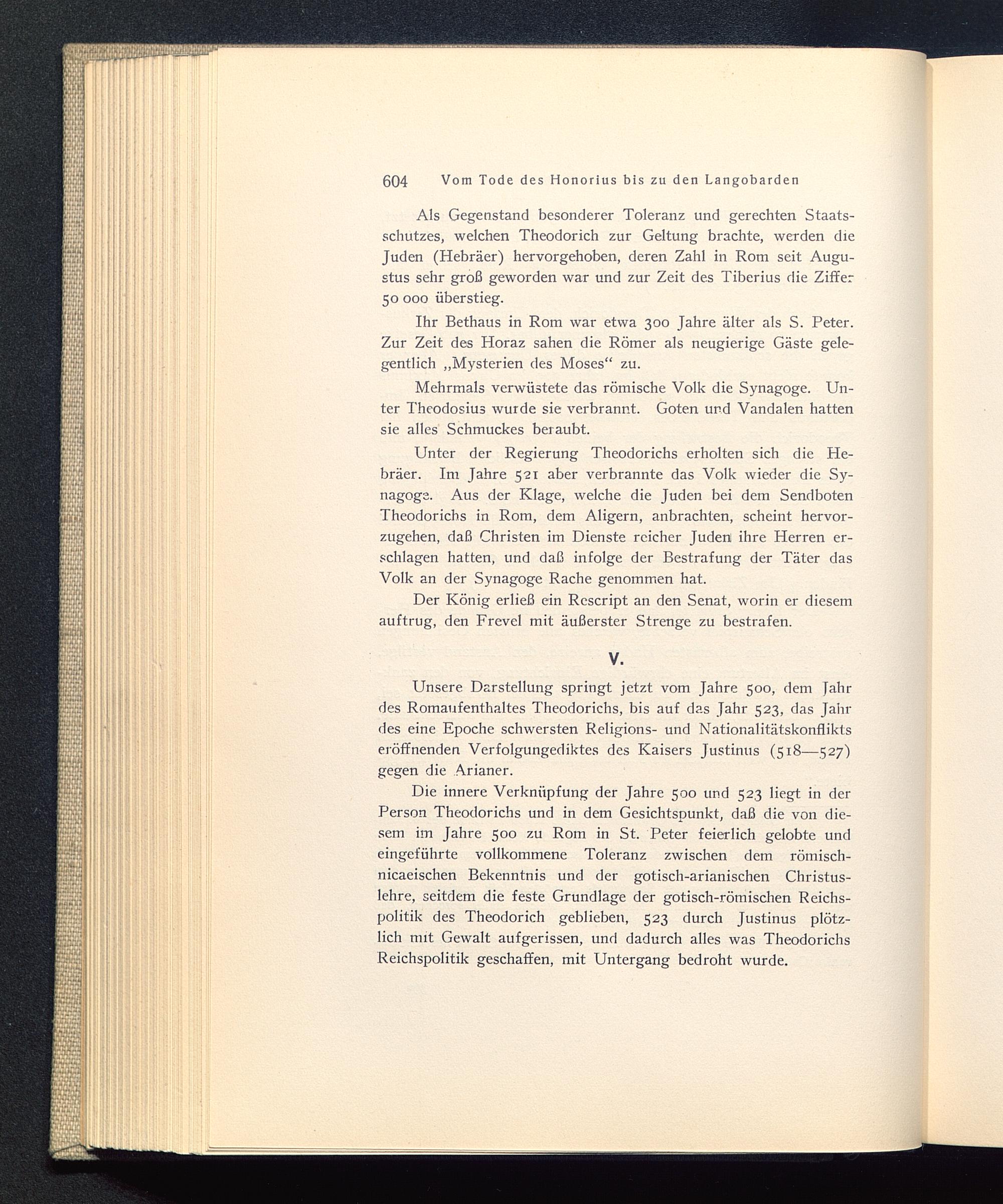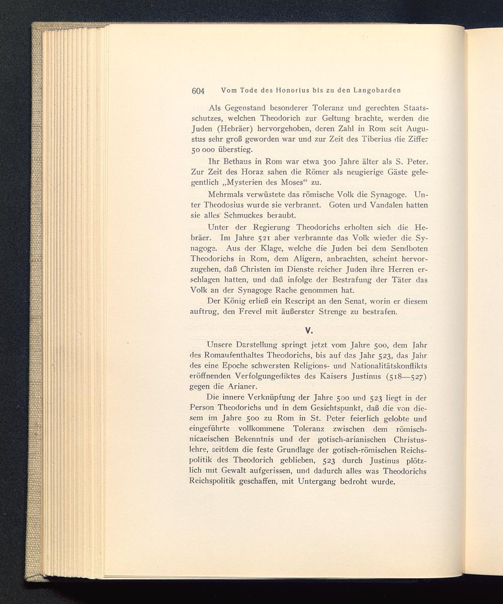 Als Gegenstand besonderer Toleranz und gerechten Staats-schutzes, welchen Theodorich zur Geltung brachte, werden dieJuden (Hebräer) hervorgehoben, deren Zahl in Rom seit Augu -stus sehr groß geworden war und zur Zeit des Tiberius die Ziffer50 000 überstieg.