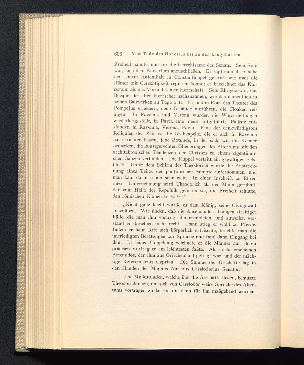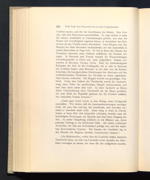 „Nicht ganz leicht wurde es dem König, seine Civilgewaltauszuüben. Wir finden, daß die Auseinandersetzungen streitigerFälle, die man ihm vortrug, ihn ermüdeten, und zuweilen ver-stand er dieselben nicht recht. Dann stieg er wohl zu Pferde.Indem er beim Ritt sich körperlich erfrischte, brachte man dieunerledigten Beratungen zur Sprache und fand dann Eingang beiihm. In seiner Umgebung zeichnete er die Männer aus, derenpräcisen Vortrag er am leichtesten faßte. Als solche erscheinenAiternidor, der ihm aus Griechenland gefolgt war, und der mäch-tige Referendarius Cyprian. Die Summe der Geschäfte lag inden Händen des Magnus Aurelius Cassiodorius Senator.“