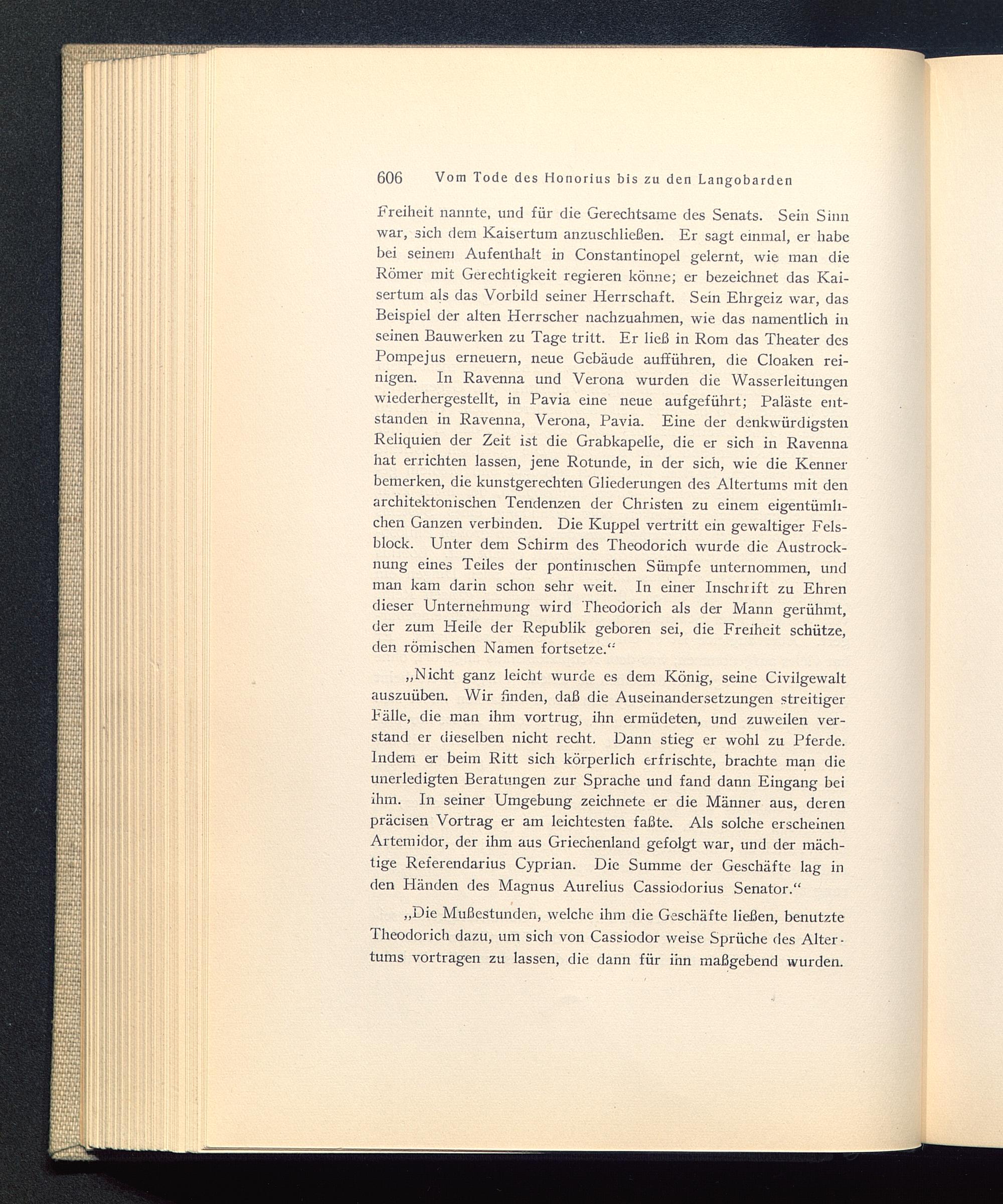 „Die Mußestunden, welche ihm die Geschäfte ließen, benutzteTheodorich dazu, um sich von Cassiodor weise Sprüche des Alter-tums vortragen zu lassen, die dann für ihn maßgebend wurden.