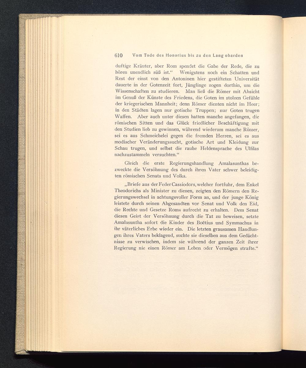 „Briefe aus der Feder Cassiodors , welcher fortfuhr, dem EnkelTheodorichs als Minister zu dienen, zeigten den Römern den Re-gierungswechsel in achtungsvoller Form an, und der junge Königleistete durch seinen Abgesandten vor Senat und Volk den Eid,die Rechte und Gesetze Roms aufrecht zu erhalten. Dem Senatdiesen Geist der Versöhnung durch die Tat zu beweisen, setzteAmalasuntha sofort die Kinder des Boetius und Symmachus inihr väterliches Erbe wieder ein. Die letzten grausamen Handlun-gen ihres Vaters beklagend, suchte sie dieselben aus dem Gedächt-nisse zu verwischen, indem sie während der ganzen Zeit ihrerRegierung nie einen Römer am Leben oder Vermögen strafte.“