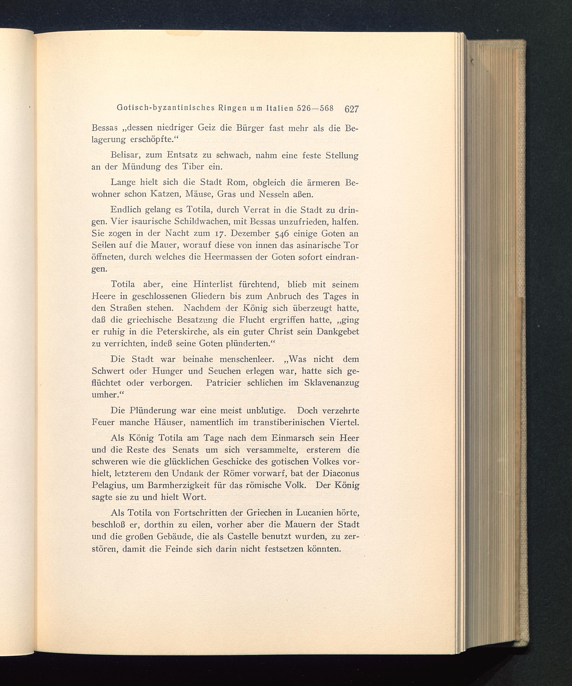 Totila aber, eine Hinterlist fürchtend, blieb mit seinemHeere in geschlossenen Gliedern bis zum Anbruch des Tages inden Straßen stehen. Nachdem der König sich überzeugt hatte,daß die griechische Besatzung die Flucht ergriffen hatte, „ginger ruhig in die Peterskirche, als ein guter Christ sein Dankgebetzu verrichten, indeß seine Goten plünderten.“