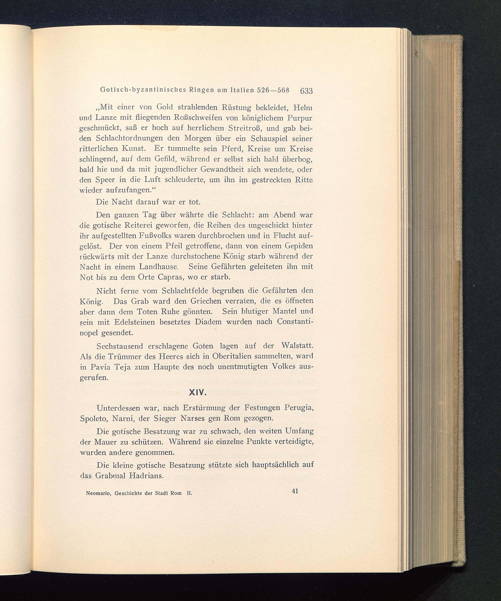 Sechstausend erschlagene Goten lagen auf der Walstatt.Als die Trümmer des Heeres sich in Oberitalien sammelten, wardin Pavia Teja zum Haupte des noch unentmutigten Volkes aus-gerufen.