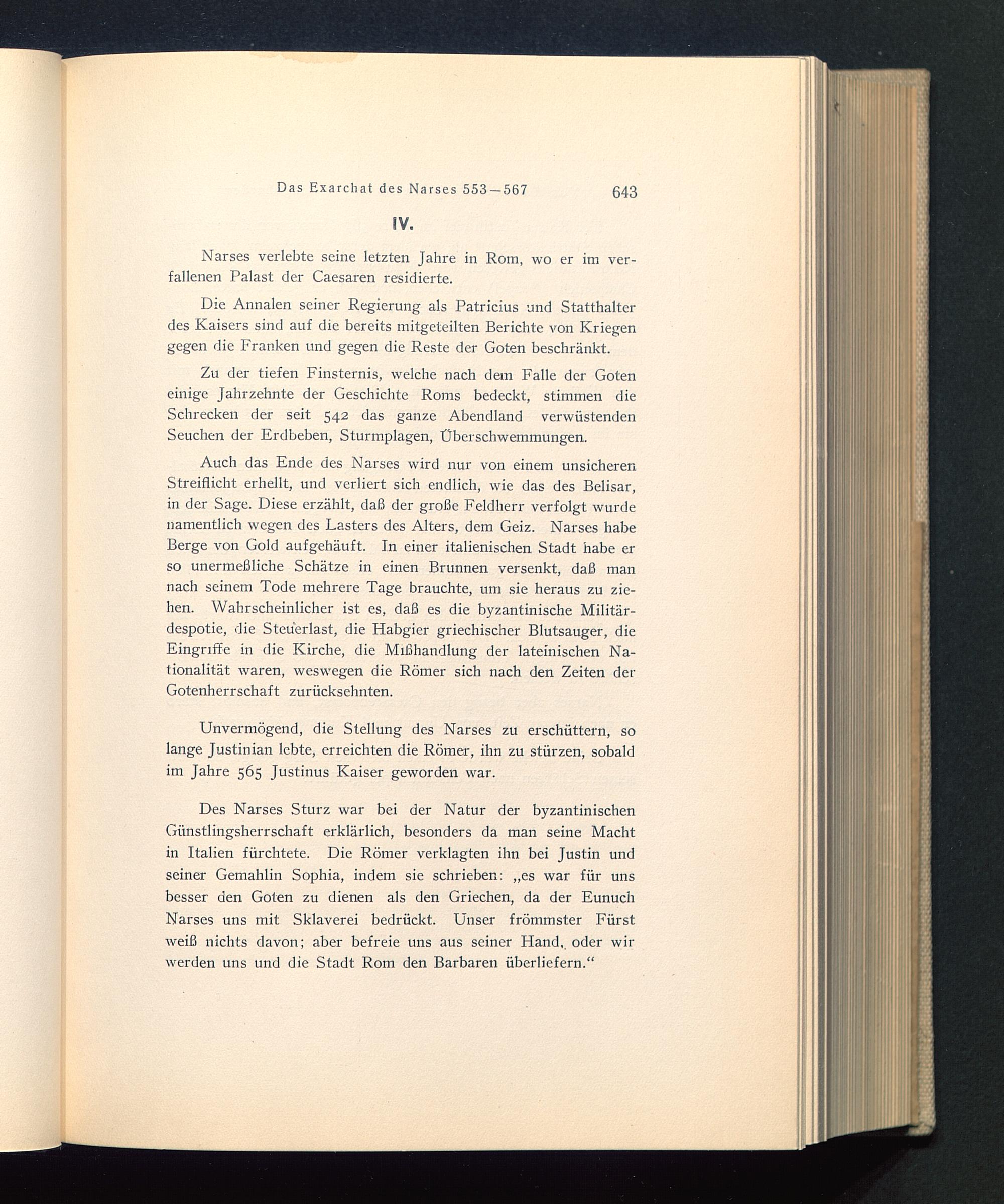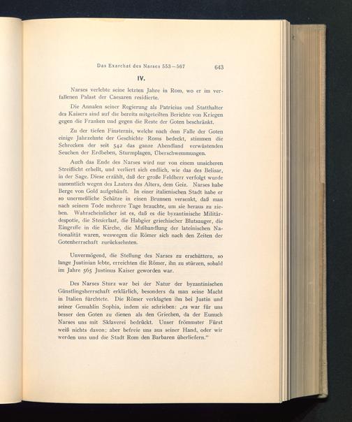 Unvermögend, die Stellung des Narses zu erschüttern, solange Justinian lebte, erreichten die Römer, ihn zu stürzen, sobaldim Jahre 565 Justinus Kaiser geworden war.