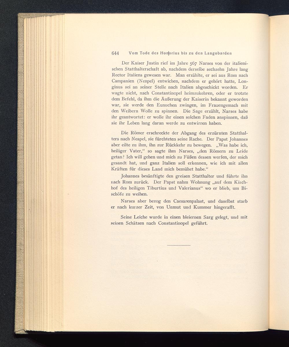 Narses aber bezog den Caesarenpalast, und daselbst starber nach kurzer Zeit, von Unmut und Kummer hingerafft.