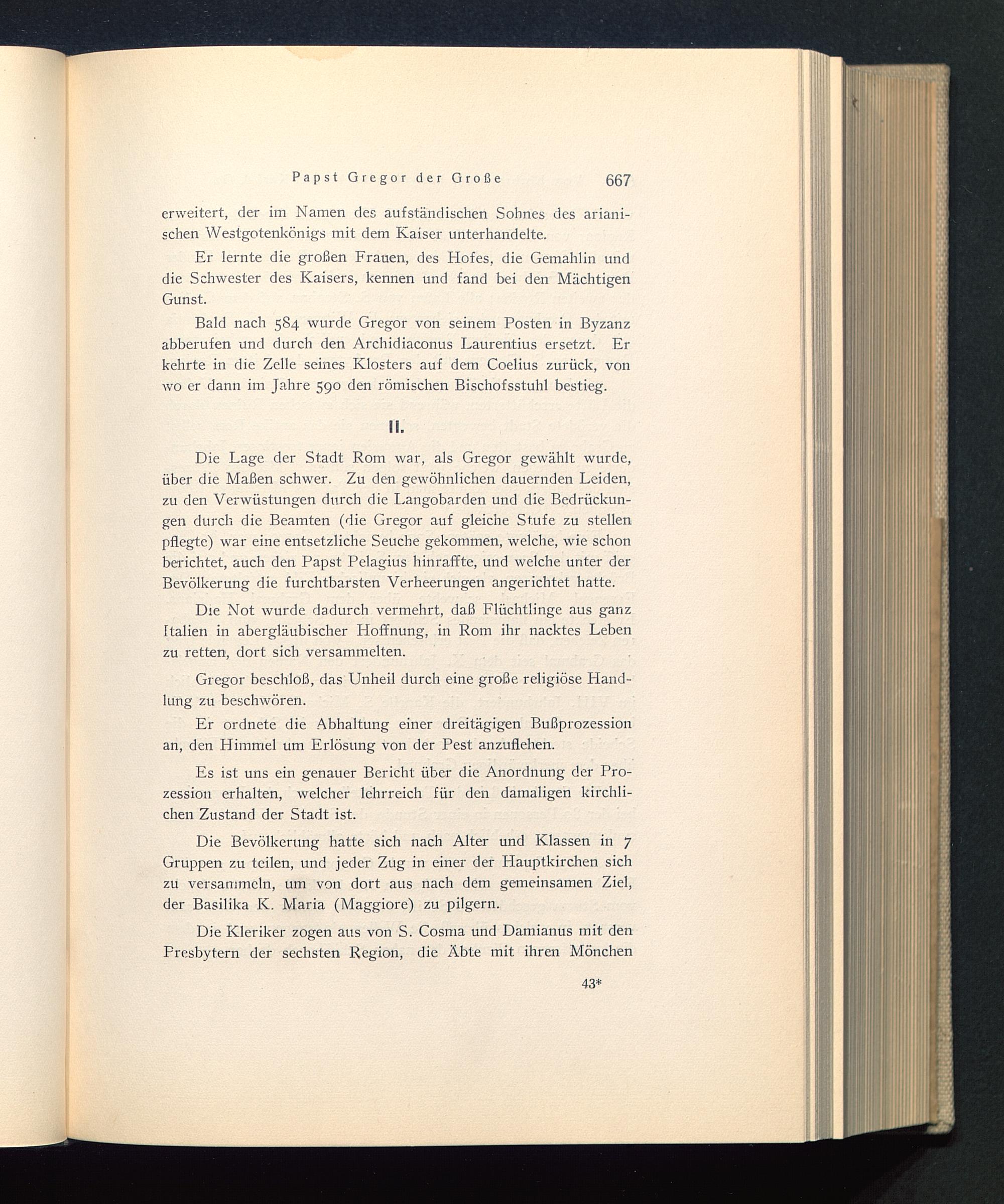 Die Lage der Stadt Rom war, als Gregor gewählt wurde,über die Maßen schwer. Zu den gewöhnlichen dauernden Leiden,zu den Verwüstungen durch die Langobarden und die Bedrückun-gen durch die Beamten (die Gregor auf gleiche Stufe zu stellenpflegte) war eine entsetzliche Seuche gekommen, welche, wie schonberichtet, auch den Papst Pelagius hinraffte, und welche unter derBevölkerung die furchtbarsten Verheerungen angerichtet hatte.