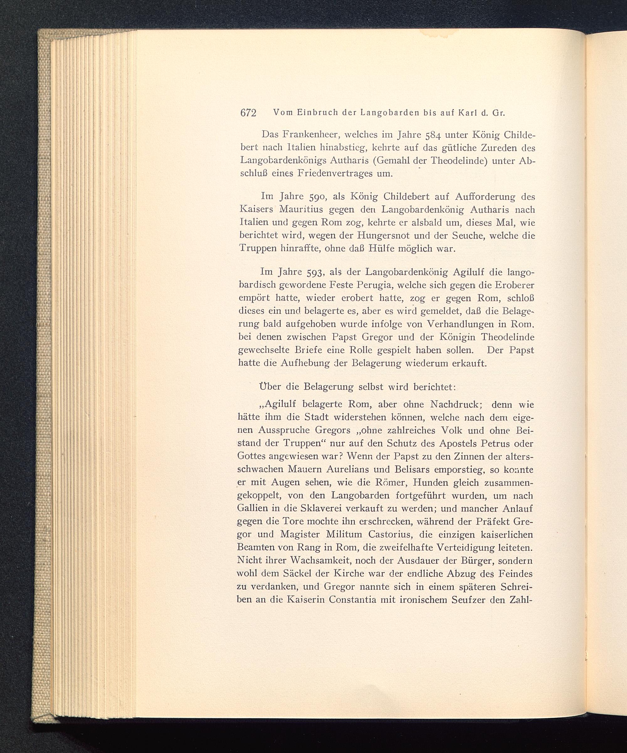 Im Jahre 593, als der Langobardenkönig Agilulf die lango-bardisch gewordene Feste Perugia , welche sich gegen die Erobererempört hatte, wieder erobert hatte, zog er gegen Rom , schloßdieses ein und belagerte es, aber es wird gemeldet, daß die Belage-rung bald aufgehoben wurde infolge von Verhandlungen in Rom.bei denen zwischen Papst. Gregor und der Königin Theodelinde gewechselte Briefe eine Rolle gespielt haben sollen. Der Papsthatte die Aufhebung der Belagerung wiederum erkauft.