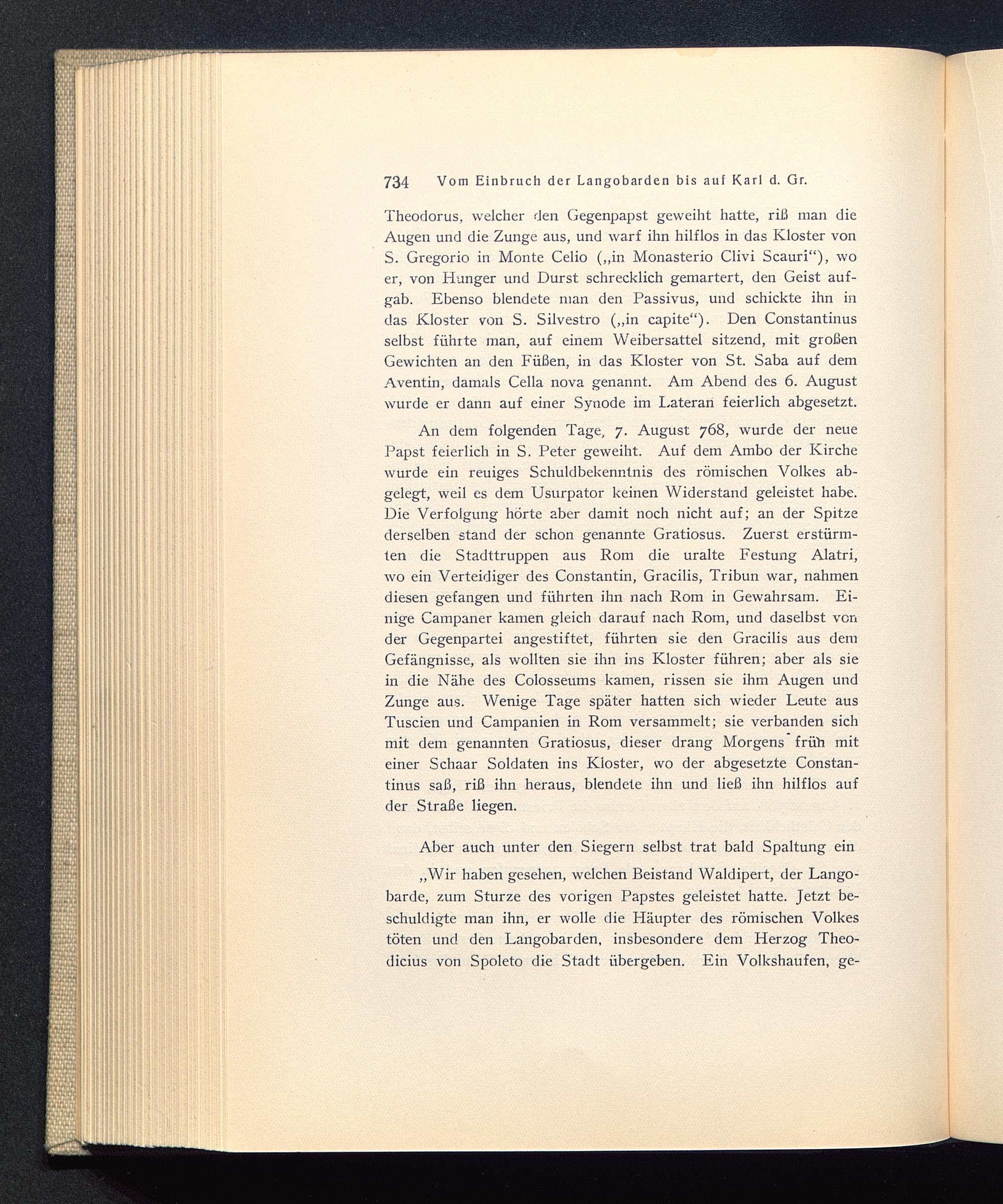 Theodorus, welcher den Gegenpapst geweiht hatte, riß man dieAugen und die Zunge aus, und warf ihn hilflos in das Kloster vonS. Gregorio in Monte Celio („in Monasterio Clivi Scauri“), woer, von Hunger und Durst schrecklich gemartert, den Geist auf-gab. Ebenso blendete man den Passivus, und schickte ihn indas Kloster von S. Silvestro („in capite“). Den Constantinusselbst führte man, auf einem Weibersattel sitzend, mit großenGewichten an den Füßen, in das Kloster von St. Saba auf demAventin, damals Cella nova genannt. Am Abend des 6. Augustwurde er dann auf einer Synode im Lateran feierlich abgesetzt.