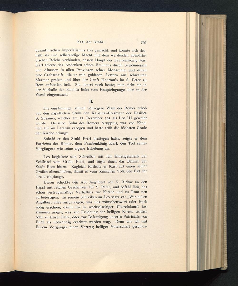 Die einstimmige, schnell vollzogene Wahl der Römer erhobauf den päpstlichen Stuhl den Kardinal-Presbyter der BasilicaS. Susanna, welcher am 27. Dezember 795 als Leo III geweihtwurde. Derselbe, Sohn des Römers Azuppius, war von Kind-heit auf im Lateran erzogen und hatte früh die höchsten Gradeder Kirche erlangt.