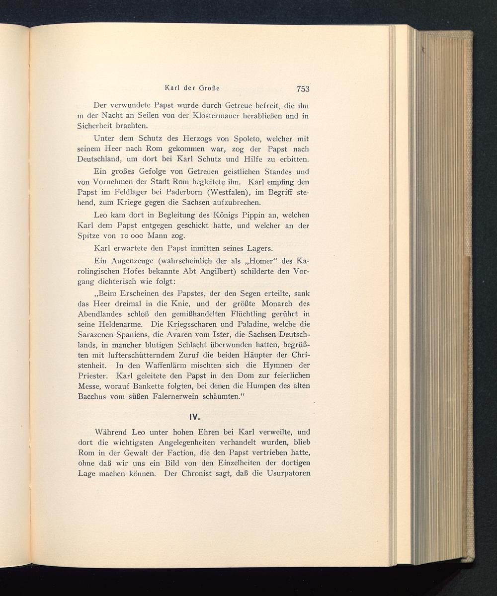 „Beim Erscheinen des Papstes, der den Segen erteilte, sankdas Heer dreimal in die Knie, und der größte Monarch desAbendlandes schloß den gemißhandelten Flüchtling gerührt inseine Heldenarme. Die Kriegsscharen und Paladine, welche dieSarazenen Spaniens, die Avaren vom Ister, die Sachsen Deutsch-lands , in mancher blutigen Schlacht überwunden hatten, begrüß-ten mit lufterschütterndem Zuruf die beiden Häupter der Chri-stenheit. In den Waffenlärm mischten sich die Hymnen derPriester. Karl geleitete den Papst in den Dom zur feierlichenMesse, worauf Bankette folgten, bei denen die Humpen des altenBacchus vom süßen Falernerwein schäumten.“