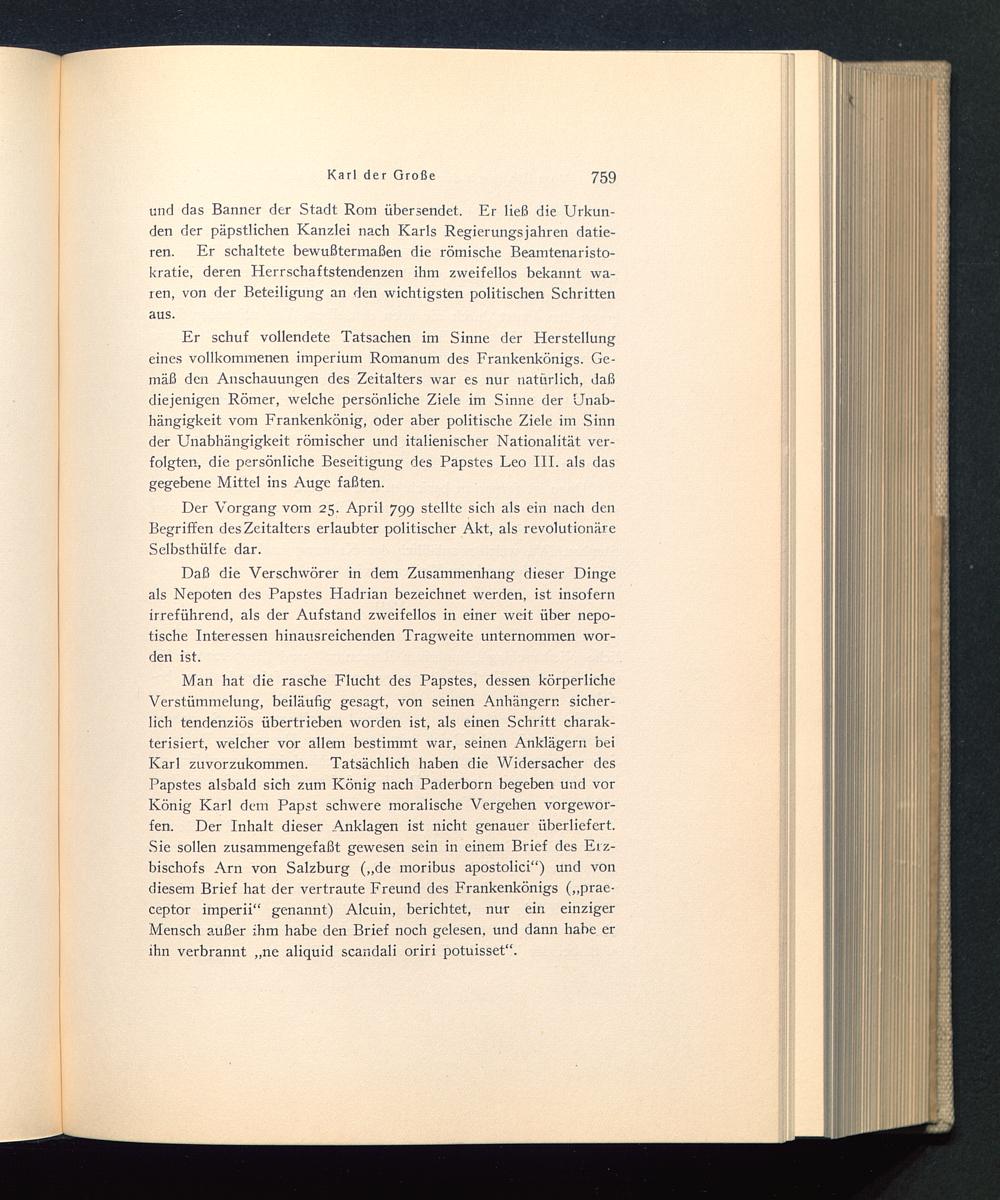 Er schuf vollendete Tatsachen im Sinne der Herstellungeines vollkommenen imperium Romanum des Frankenkönigs. Ge-mäß den Anschauungen des Zeitalters war es nur natürlich, daßdiejenigen Römer, welche persönliche Ziele im Sinne der Unab-hängigkeit vom Frankenkönig, oder aber politische Ziele im Sinnder Unabhängigkeit römischer und italienischer Nationalität ver-folgten, die persönliche Beseitigung des Papstes Leo III. als dasgegebene Mittel ins Auge faßten.