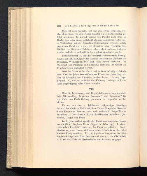 Im 8. Jahrhundert spricht der Papst von respublica Roma-norum (Brief Stephans II. an Pippin im Jahre 753). In dieser„römischen Republik“ hatte nur der Papst zu gebieten. Dieserahndete es, wenn Leute, sich ohne seine Erlaubnis an den frän-kischen König wandten. Er trat jeglichem Ansprüche der frän-kischen Könige oder ihrer Beamten auf eine Art von Oberhoheit,z. B. bei der Wahl des Erzbischofes von Ravenna, entgegen.