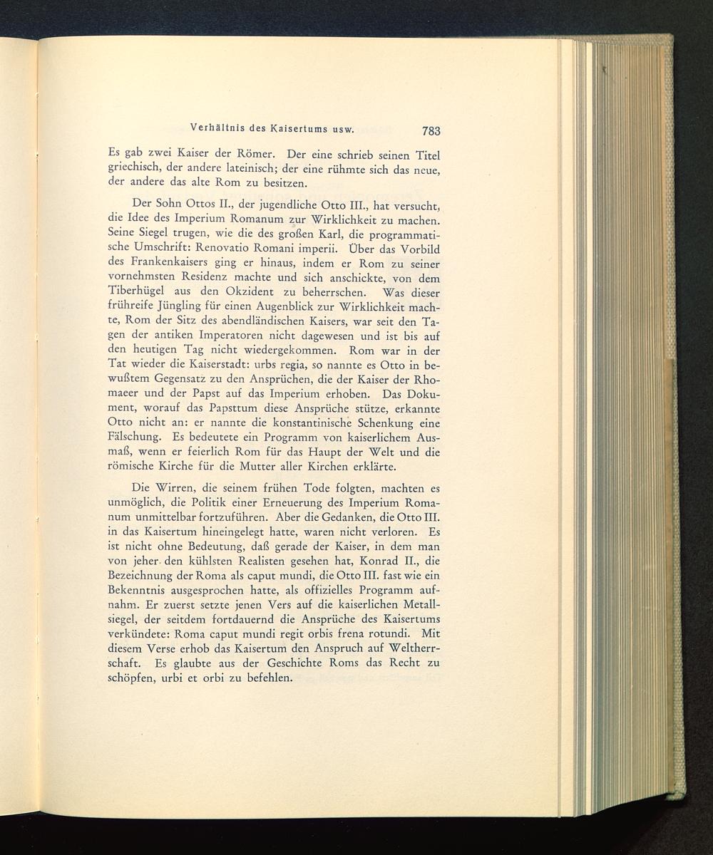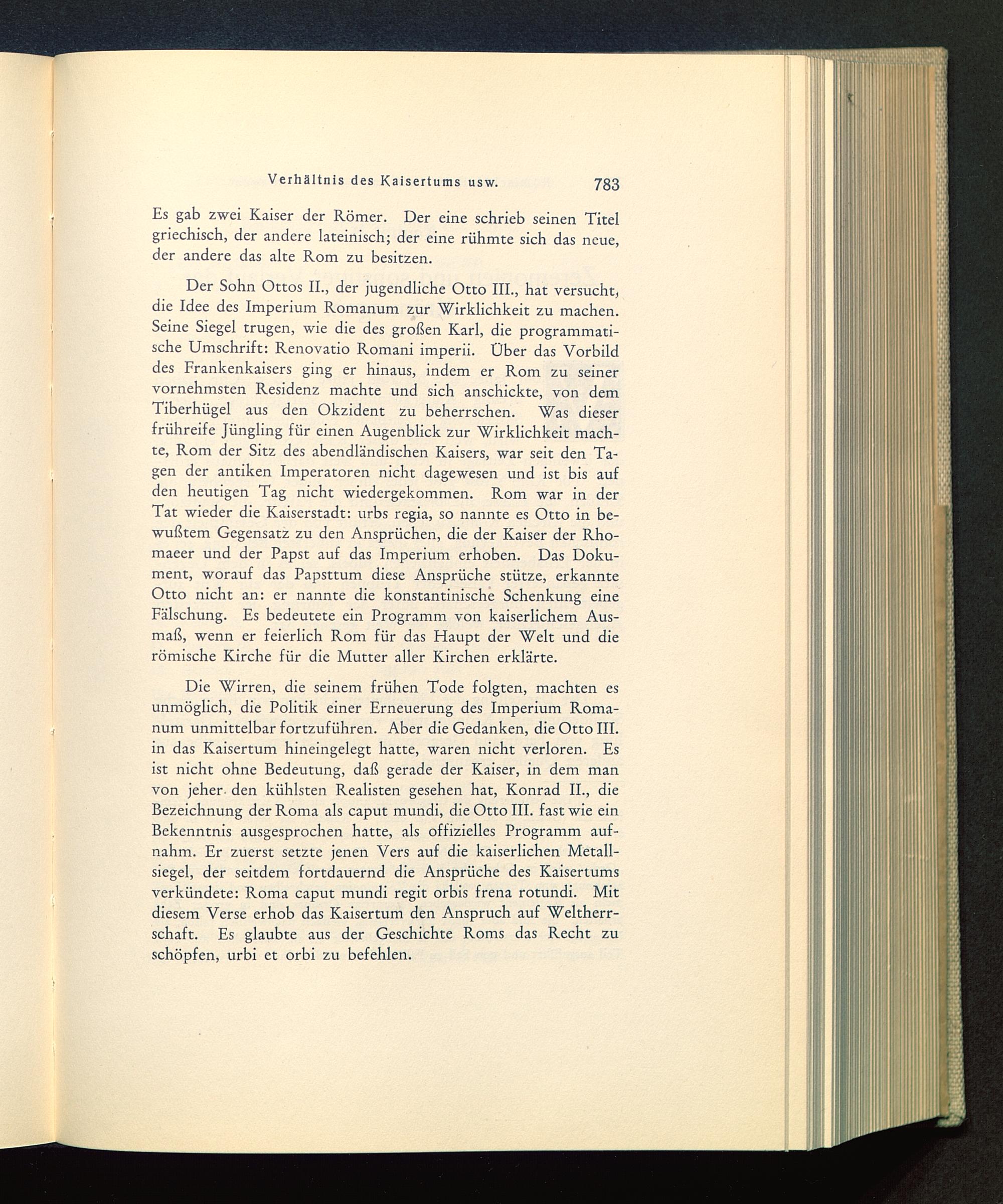Die Wirren, die seinem frühen Tode folgten, machten esunmöglich, die Politik einer Erneuerung des Imperium Roma-num unmittelbar fortzuführen. Aber die Gedanken, die Otto III. in das Kaisertum hineingelegt hatte, waren nicht verloren. Esist nicht ohne Bedeutung, daß gerade der Kaiser, in dem manvon jeher- den kühlsten Realisten gesehen hat, Konrad II. , dieBezeichnung der Roma als caput mundi, die Otto III. fast wie einBekenntnis ausgesprochen hatte, als offizielles Programm auf-nahm. Er zuerst setzte jenen Vers auf die kaiserlichen Metall-siegel, der seitdem fortdauernd die Ansprüche des Kaisertumsverkündete: Roma caput mundi regit orbis frena rotundi. Mitdiesem Verse erhob das Kaisertum den Anspruch auf Weltherr-schaft. Es glaubte aus der Geschichte Roms das Recht zuschöpfen, urbi et orbi zu befehlen.