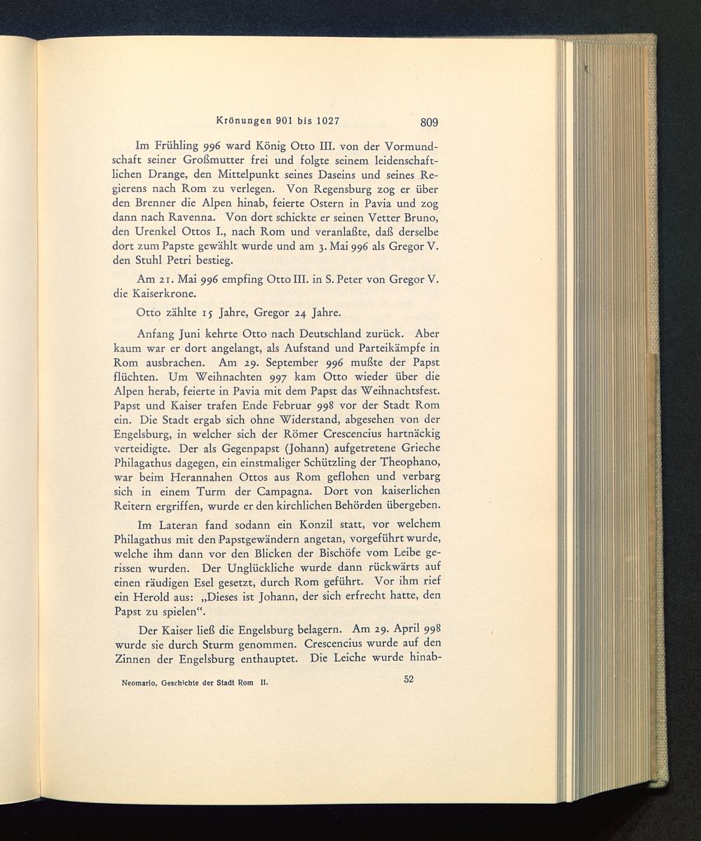 Im Frühling 996 ward König Otto III. von der Vormund-schaft seiner Großmutter frei und folgte seinem leidenschaft-lichen Drange, den Mittelpunkt seines Daseins und seines Re-gierens nach Rom zu verlegen. Von Regensburg zog er überden Brenner die Alpen hinab, feierte Ostern in Pavia und zogdann nach Ravenna. Von dort schickte er seinen Vetter Bruno,den Urenkel Ottos I., nach Rom und veranlaßte, daß derselbedort zum Papste gewählt wurde und am 3. Mai 996 als Gregor V. den Stuhl Petri bestieg.
