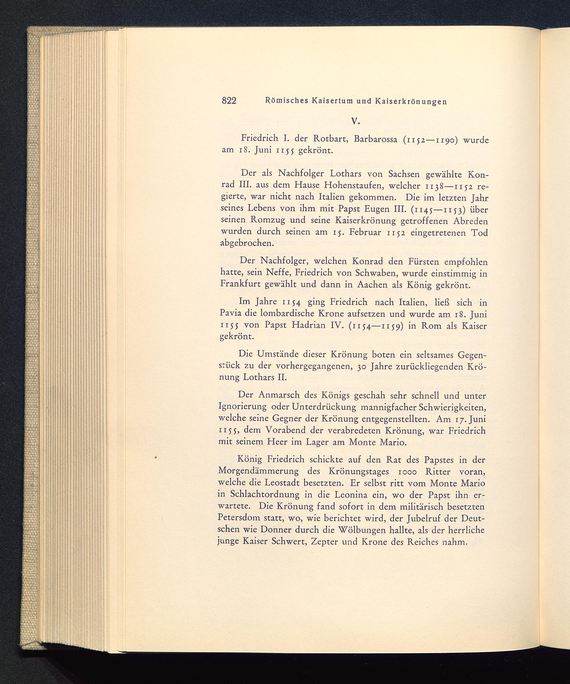 König Friedrich schickte auf den Rat des Papstes in derMorgendämmerung des Krönungstages 1000 Ritter voran,welche die Leostadt besetzten. Er selbst ritt vom Monte Marioin Schlachtordnung in die Leonina ein, wo der Papst ihn er-wartete. Die Krönung fand sofort in dem militärisch besetztenPetersdom statt, wo, wie berichtet wird, der Jubelruf der Deut-schen wie Donner durch die Wölbungen hallte, als der herrlichejunge Kaiser Schwert, Zepter und Krone des Reiches nahm.