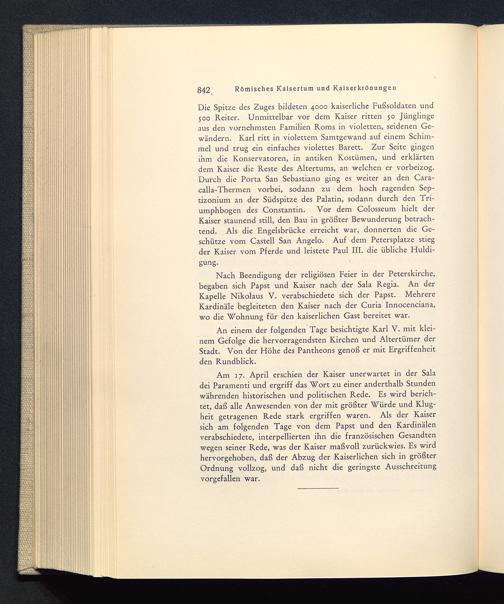 An einem der folgenden Tage besichtigte Karl V. mit klei-nem Gefolge die hervorragendsten Kirchen und Altertümer derStadt. Von der Höhe des Pantheons genoß er mit Ergriffenheitden Rundblick.