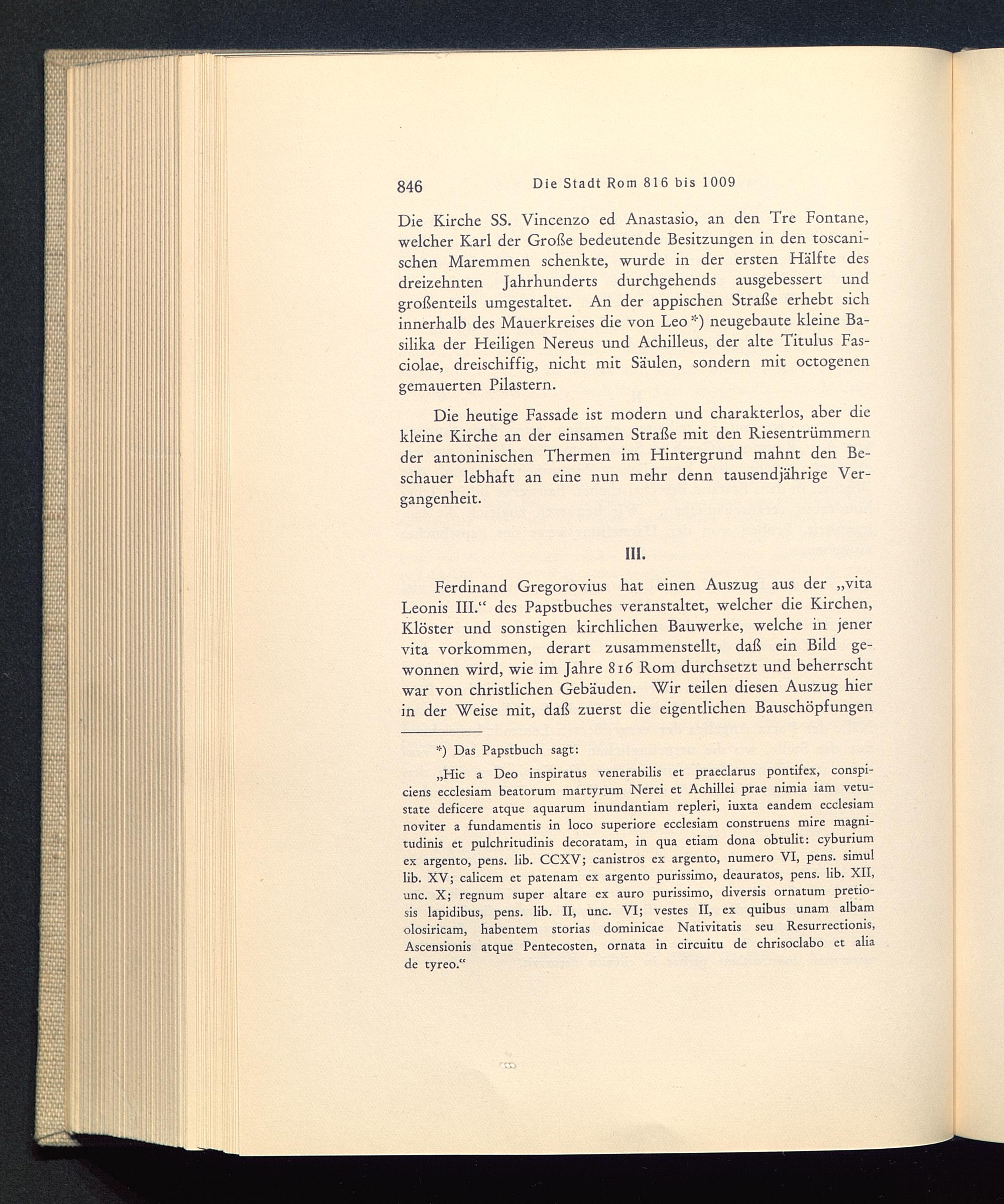 Die Kirche SS. Vincenzo ed Anastasio, an den Tre Fontane,welcher Karl der Große bedeutende Besitzungen in den toscani-schen Maremmen schenkte, wurde in der ersten Hälfte desdreizehnten Jahrhunderts durchgehends ausgebessert undgroßenteils umgestaltet. An der appischen Straße erhebt sichinnerhalb des Mauerkreises die von Leo *) neugebaute kleine Ba-silika der Heiligen Nereus und Achilleus, der alte Titulus Fas-ciolae, dreischiffig, nicht mit Säulen, sondern mit octogenengemauerten Pilastern.