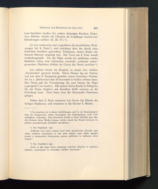(I.) Leo verbesserte und vergrößerte die bischöflichen Woh-nungen bei S. Peter 1 '), und errichtete dort das durch seineSchönheit berühmt gewordene Triclinium, dessen Boden mitbuntem Marmor ausgelegt war. Der Turm am S. Peter wurdewiederhergestellt. Für die Pilger wurde ein prächtiges rundesBadehaus neben dem bekannten, nunmehr „columna maior“genannten Obelisken (früher im Circus des Nero) errichtet *).