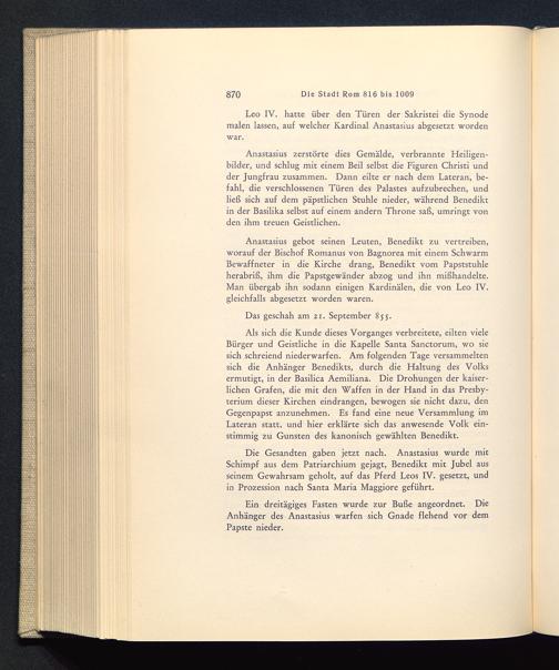 Anastasius zerstörte dies Gemälde, verbrannte Heiligen-bilder, und schlug mit einem Beil selbst die Figuren Christi undder Jungfrau zusammen. Dann eilte er nach dem Lateran, be-fahl, die verschlossenen Türen des Palastes aufzubrechen, undließ sich auf dem päpstlichen Stuhle nieder, während Benediktin der Basilika selbst auf einem andern Throne saß, umringt vonden ihm treuen Geistlichen.