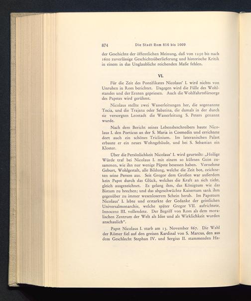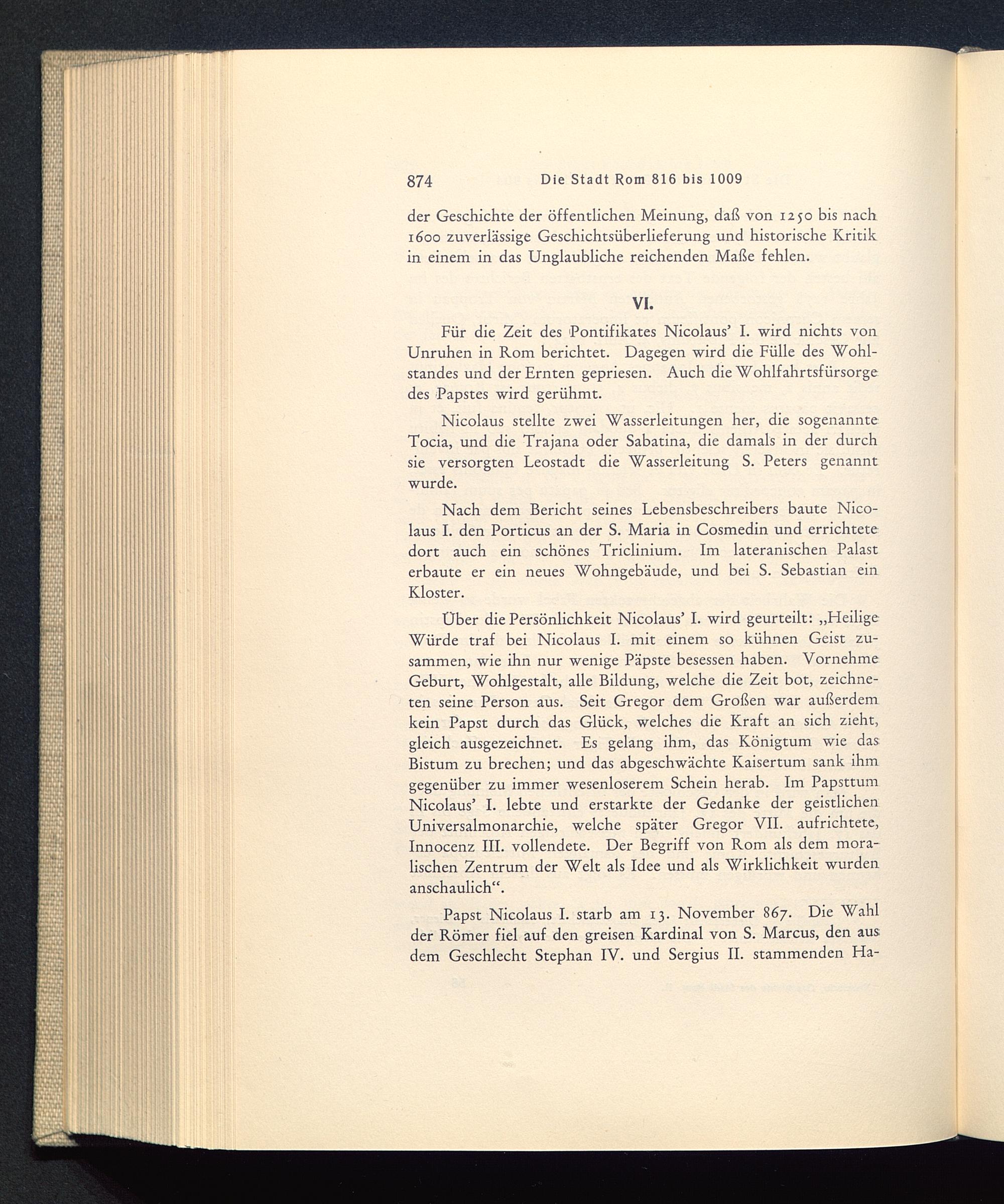 Für die Zeit des 'Pontifikates Nicolaus’ I. wird nichts vonUnruhen in Rom berichtet. Dagegen wird die Fülle des Wohl-standes und der Ernten gepriesen. Auch die Wohlfahrtsfürsorgedes Papstes wird gerühmt.