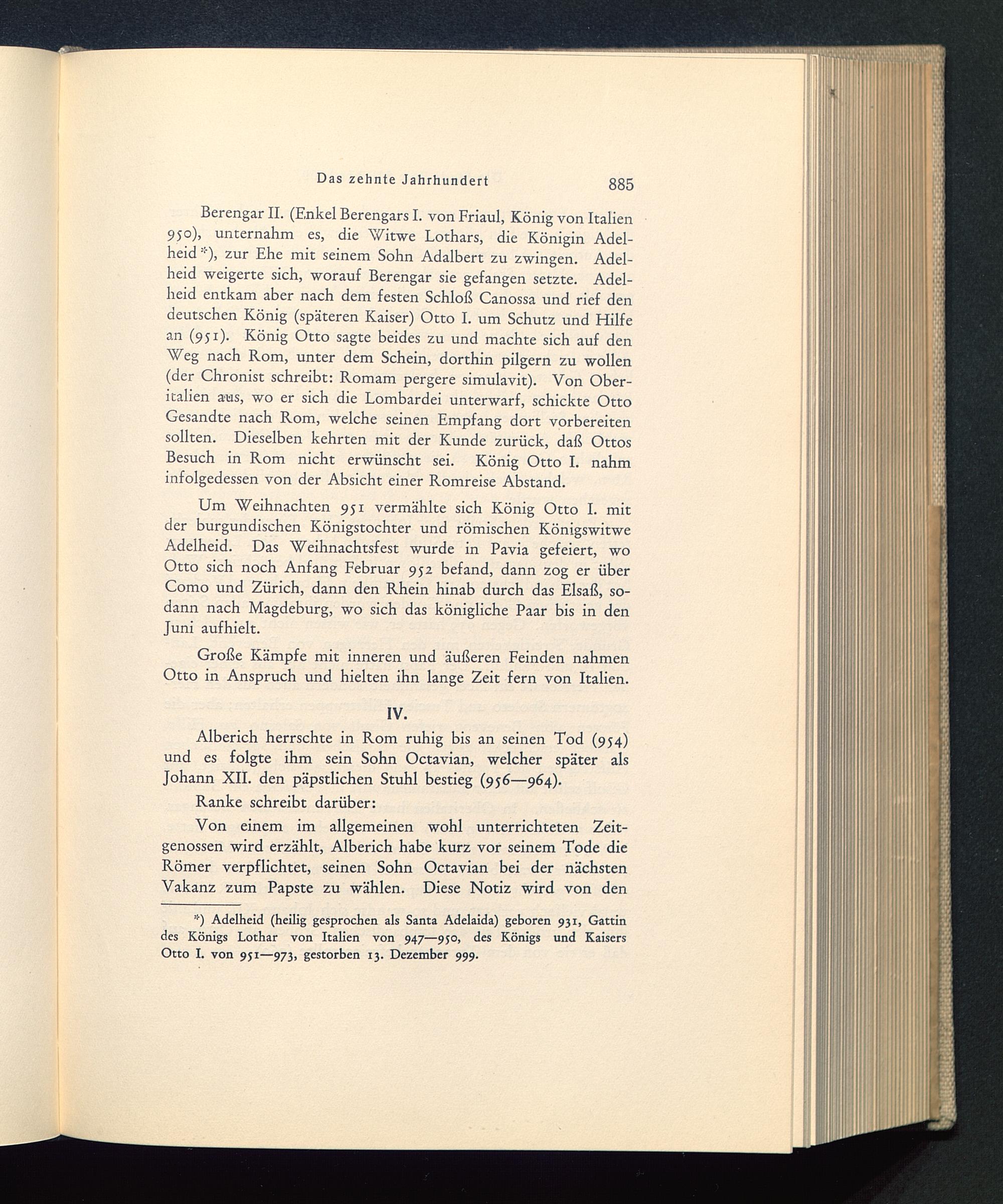 Berengar II. (Enkel Berengars I. von Friaul, König von Italien950), unternahm es, die Witwe Lothars, die Königin Adel-heid "■), zur Ehe mit seinem Sohn Adalbert zu zwingen. Adel-heid weigerte sich, worauf Berengar sie gefangen setzte. Adel-heid entkam aber nach dem festen Schloß Canossa und rief dendeutschen König (späteren Kaiser) Otto I. um Schutz und Hilfean (951). König Otto sagte beides zu und machte sich auf denWeg nach Rom , unter dem Schein, dorthin pilgern zu wollen(der Chronist schreibt: Romam pergere simulavit). Von Ober-italien aus, wo er sich die Lombardei unterwarf, schickte OttoGesandte nach Rom , welche seinen Empfang dort vorbereitensollten. Dieselben kehrten mit der Kunde zurück, daß OttosBesuch in Rom nicht erwünscht sei. König Otto I. nahminfolgedessen von der Absicht einer Romreise Abstand.