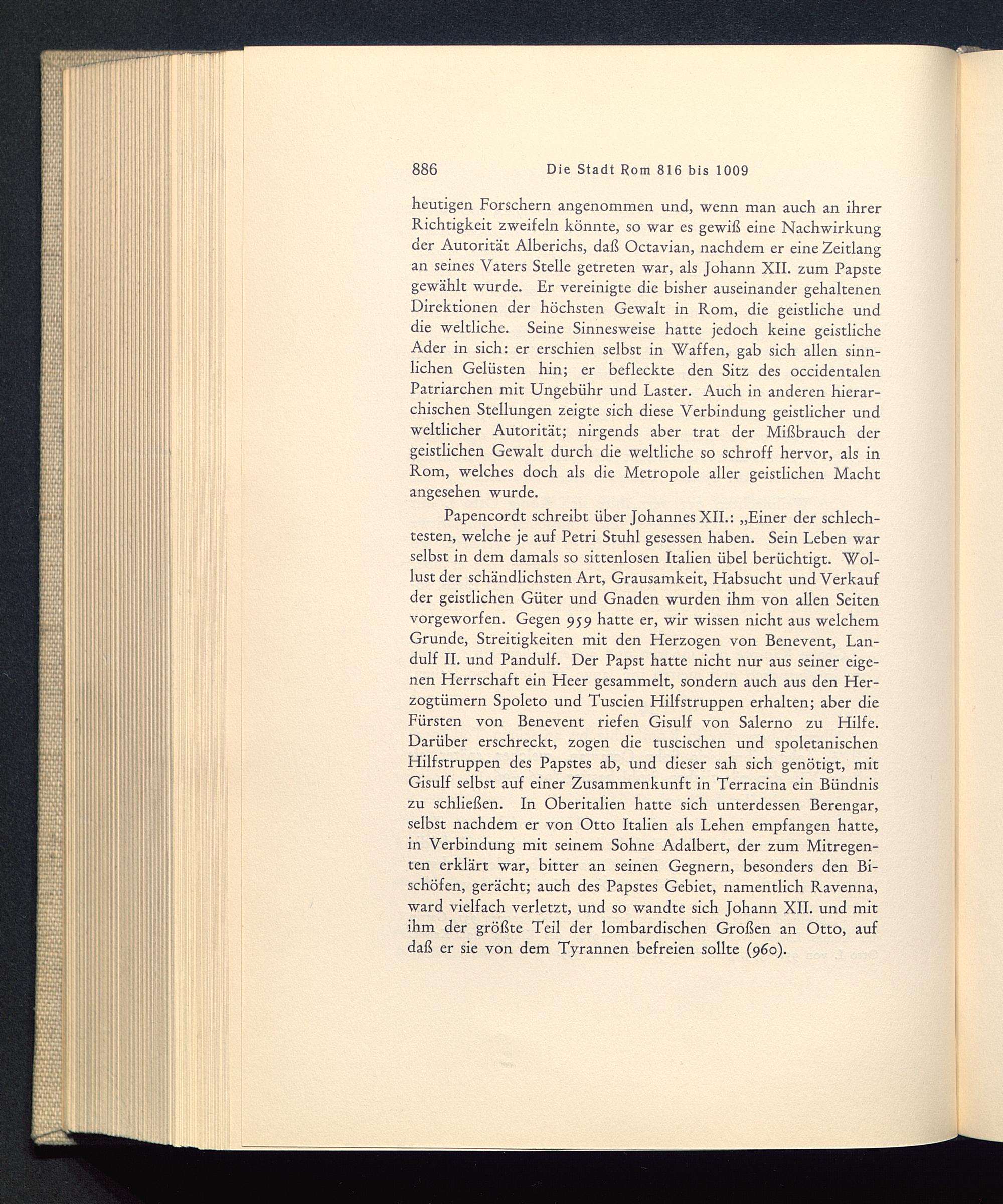 Papencordt schreibt über Johannes XII. : „Einer der schlech-testen, welche je auf Petri Stuhl gesessen haben. Sein Leben warselbst in dem damals so sittenlosen Italien übel berüchtigt. Wol-lust der schändlichsten Art, Grausamkeit, Habsucht und Verkaufder geistlichen Güter und Gnaden wurden ihm von allen Seitenvorgeworfen. Gegen 959 hatte er, wir wissen nicht aus welchemGrunde, Streitigkeiten mit den Herzogen von Benevent , Lan-dulf II. und Pandulf. Der Papst hatte nicht nur aus seiner eige-nen Herrschaft ein Heer gesammelt, sondern auch aus den Her-zogtümern Spoleto und Tuscien Hilf Struppen erhalten; aber dieFürsten von Benevent riefen Gisulf von Salerno zu Hilfe.Darüber erschreckt, zogen die tuscischen und spoletanischenHilfstruppen des Papstes ab, und dieser sah sich genötigt, mitGisulf selbst auf einer Zusammenkunft in Terracina ein Bündniszu schließen. In Oberitalien hatte sich unterdessen Berengar,selbst nachdem er von Otto Italien als Lehen empfangen hatte,in Verbindung mit seinem Sohne Adalbert, der zum Mitregen-ten erklärt war, bitter an seinen Gegnern, besonders den Bi-schöfen, gerächt; auch des Papstes Gebiet, namentlich Ravenna,ward vielfach verletzt, und so wandte sich Johann XII . und mitihm der größte Teil der lombardischen Großen an Otto, aufdaß er sie von dem Tyrannen befreien sollte (960).