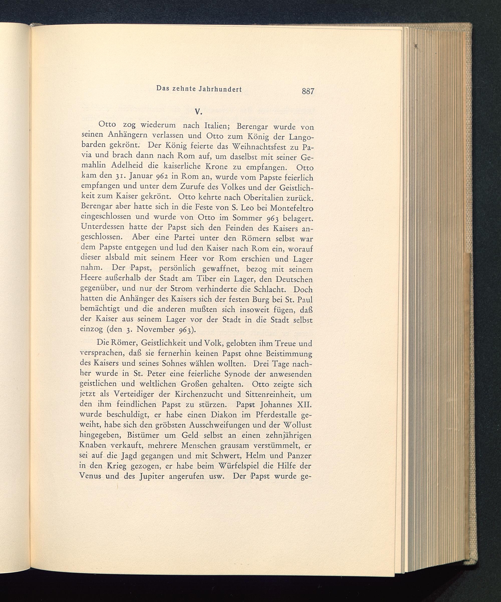 Otto zog wiederum nach Italien ; Berengar wurde vonseinen Anhängern verlassen und Otto zum König der Lango-barden gekrönt. Der König feierte das Weihnachtsfest zu Pa-via und brach dann nach Rom auf, um daselbst mit seiner Ge-mahlin Adelheid die kaiserliche Krone zu empfangen. Ottokam den 31. Januar 962 in Rom an, wurde vom Papste feierlichempfangen und unter dem Zurufe des Volkes und der Geistlich-keit zum Kaiser gekrönt. Otto kehrte nach Oberitalien zurück.Berengar aber hatte sich in die Feste von S. Leo bei Montefeltroeingeschlossen und wurde von Otto im Sommer 963 belagert.Unterdessen hatte der Papst sich den Feinden des Kaisers an-geschlossen. Aber eine Partei unter den Römern selbst wardem Papste entgegen und lud den Kaiser nach Rom ein, woraufdieser alsbald mit seinem Heer vor Rom erschien und Lagernahm. Der Papst, persönlich gewaffnet, bezog mit seinemHeere außerhalb der Stadt am Tiber ein Lager, den Deutschengegenüber, und nur der Strom verhinderte die Schlacht. Dochhatten die Anhänger des Kaisers sich der festen Burg bei St. Paulbemächtigt und die anderen mußten sich insoweit fügen, daßder Kaiser aus seinem Lager vor der Stadt in die Stadt selbsteinzog (den 3. November 963).