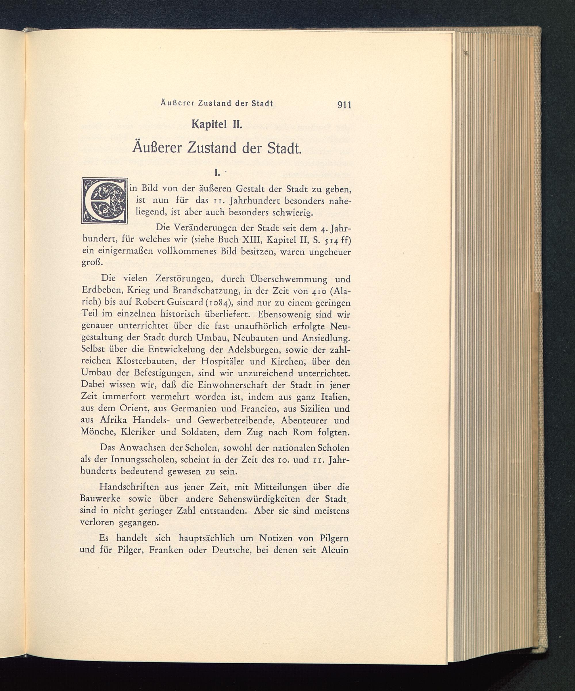 Die vielen Zerstörungen, durch Überschwemmung undErdbeben, Krieg und Brandschatzung, in der Zeit von 410 (Ala-rich) bis auf Robert Guiscard (1084), sind nur zu einem geringenTeil im einzelnen historisch überliefert. Ebensowenig sind wirgenauer unterrichtet über die fast unaufhörlich erfolgte Neu-gestaltung der Stadt durch Umbau, Neubauten und Ansiedlung.Selbst über die Entwickelung der Adelsburgen, sowie der zahl-reichen Klosterbauten, der Hospitäler und Kirchen, über denUmbau der Befestigungen, sind wir unzureichend unterrichtet.Dabei wissen wir, daß die Einwohnerschaft der Stadt in jenerZeit immerfort vermehrt worden ist, indem aus ganz Italien ,aus dem Orient, aus Germanien und Francien, aus Sizilien undaus Afrika Handels- und Gewerbetreibende, Abenteurer undMönche, Kleriker und Soldaten, dem Zug nach Rom folgten.