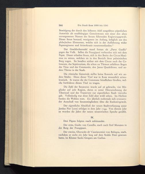 Der Geschlechteradel stand fortan als „Parte Guelfa“gegen das Volk. Selbst die Frangipani verbanden sich mit demPapst. Dieser erlaubte ihnen, sich in den Besitz des Circus Maxi-mus zu setzen, welchen sie in den Bereich ihrer palatinischenBurg zogen. Sie besaßen seither mit dem Circus auch das Co-losseum, das Septizonium, die schon zu Türmen erhöhten Bogendes Titus und des Constantin, den Janus Quadrifrons , und an-dere Türme in der Stadt.