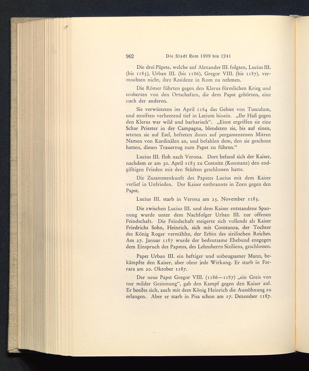 Die drei Päpste, welche auf Alexander III. folgten, Lucius III. (bis 1185), Urban III. (bis 1186), Gregor VIII. (bis 1187), ver-mochten nicht, ihre Residenz in Rom zu nehmen.