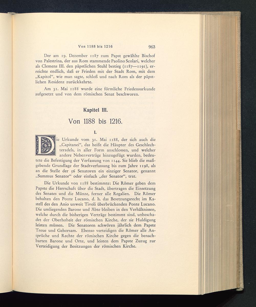Der am 19. Dezember 1187 zum Papst gewählte Bischofvon Palestrina, der aus Rom stammende Paolino Scolari, welcherals Clemens III. den päpstlichen Stuhl bestieg (1187—1191), er-reichte endlich, daß er Frieden mit der Stadt Rom , mit dem„Kapitol“, wie man sagte, schloß und nach Rom als der päpst-lichen Residenz zurückkehrte.