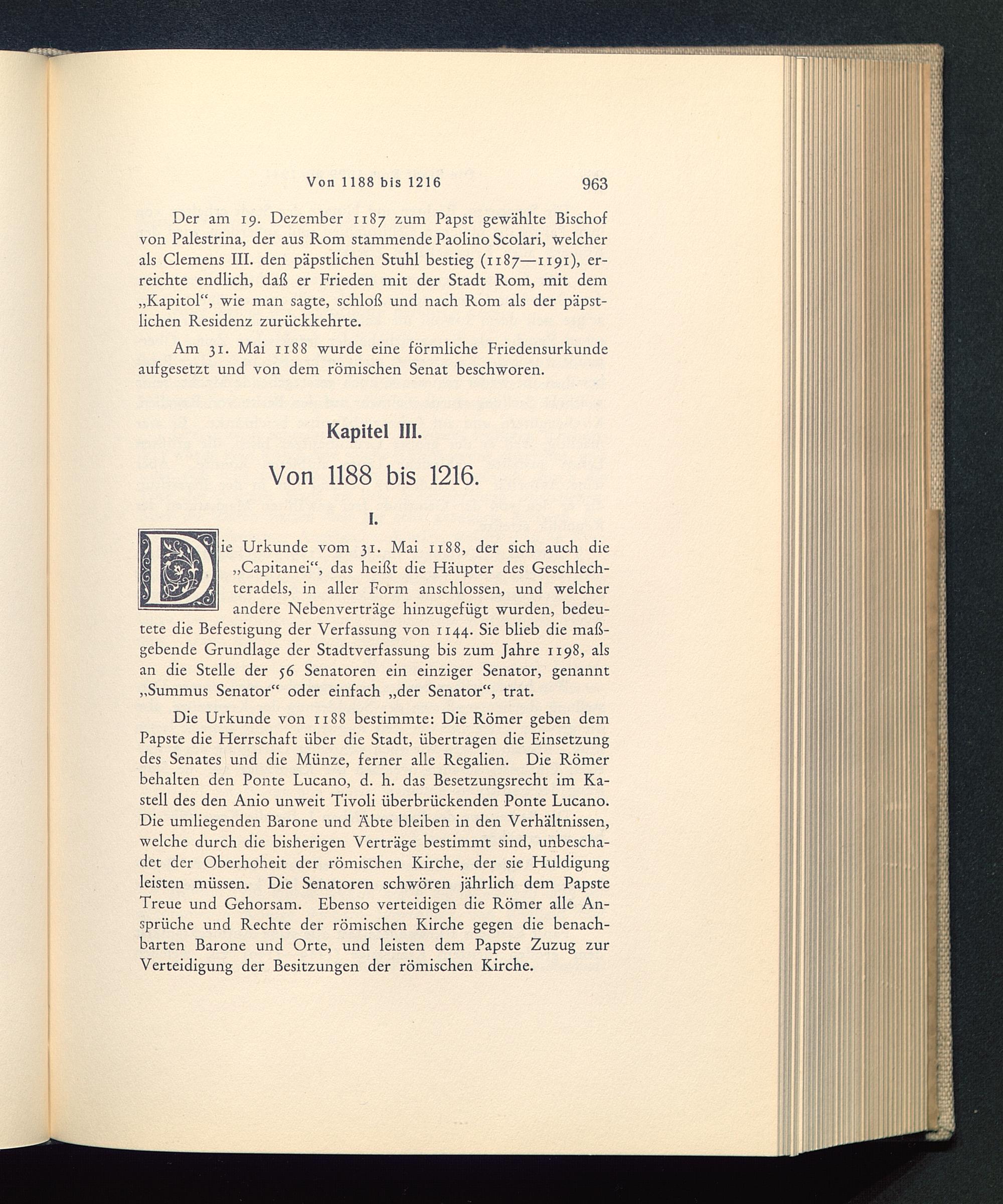 ie Urkunde vom 31. Mai 1188, der sich auch die„Capitanei“, das heißt die Häupter des Geschlech-teradels, in aller Form anschlossen, und welcherandere Nebenverträge hinzugefügt wurden, bedeu-tete die Befestigung der Verfassung von 1144. Sie blieb die maß-gebende Grundlage der Stadtverfassung bis zum Jahre 1198, alsan die Stelle der 5 6 Senatoren ein einziger Senator, genannt„Summus Senator“ oder einfach „der Senator“, trat.