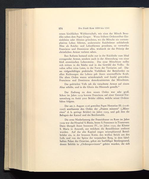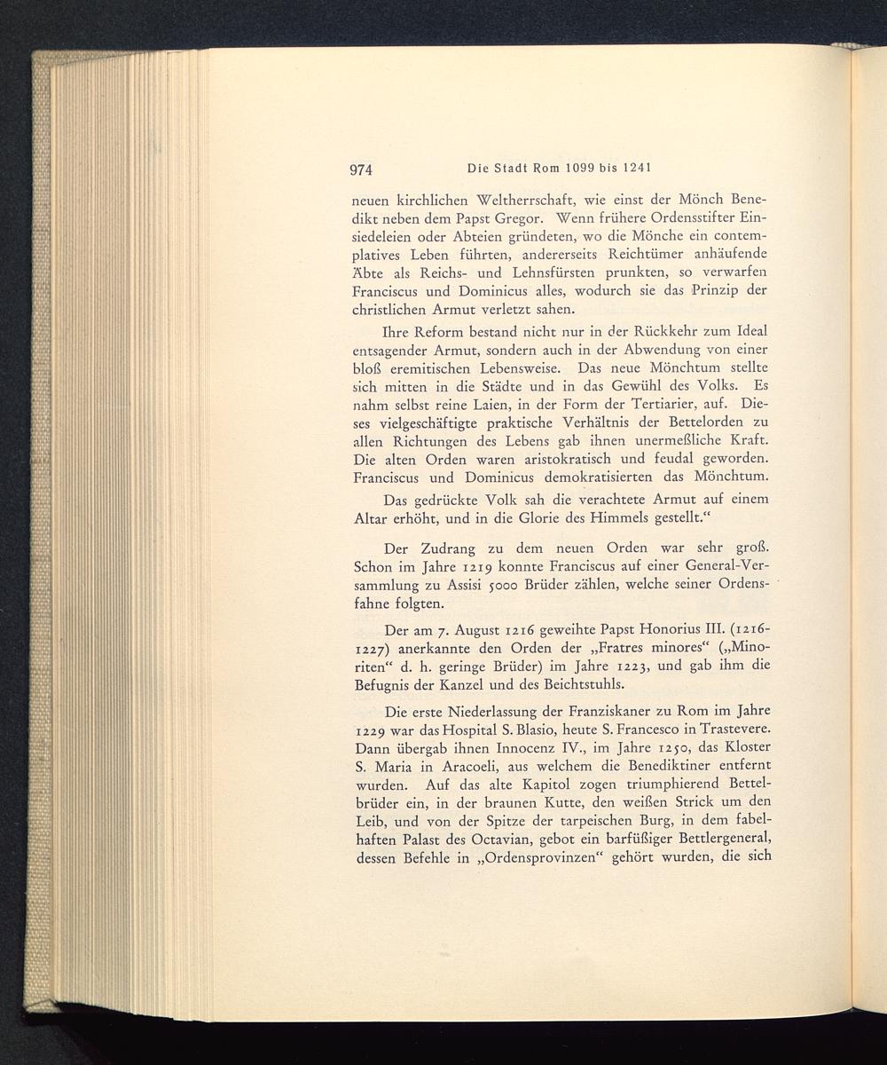 Die erste Niederlassung der Franziskaner zu Rom im Jahre1229 war das Hospital S. Blasio, heute S. Francesco in Trastevere .Dann übergab ihnen Innocenz IV., im Jahre x230, das KlosterS. Maria in Aracoeli, aus welchem die Benediktiner entferntwurden. Auf das alte Kapitol zogen triumphierend Bettel-brüder ein, in der braunen Kutte, den weißen Strick um denLeib, und von der Spitze der tarpeischen Burg, in dem fabel-haften Palast des Octavian, gebot ein barfüßiger Bettlergeneral,dessen Befehle in „Ordensprovinzen“ gehört wurden, die sich