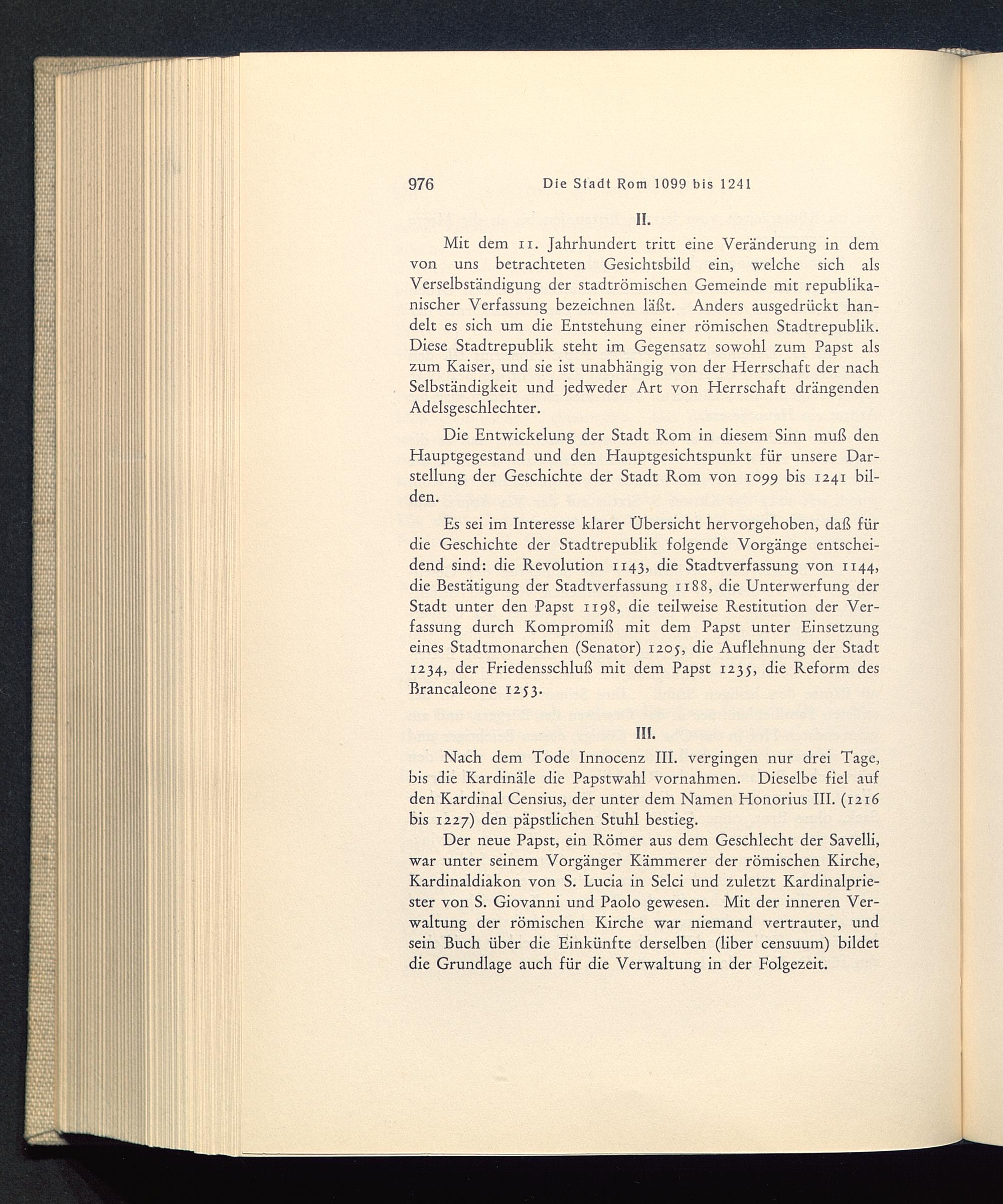 Es sei im Interesse klarer Übersicht hervorgehoben, daß fürdie Geschichte der Stadtrepublik folgende Vorgänge entschei-dend sind: die Revolution 1143, die Stadtverfassung von 1144,die Bestätigung der Stadtverfassung 1188, die Unterwerfung derStadt unter den Papst 1198, die teilweise Restitution der Ver-fassung durch Kompromiß mit dem Papst unter Einsetzungeines Stadtmonarchen (Senator) 1205, die Auflehnung der Stadt1234, der Friedensschluß mit dem Papst 1235, die Reform desBrancaleone 1253.