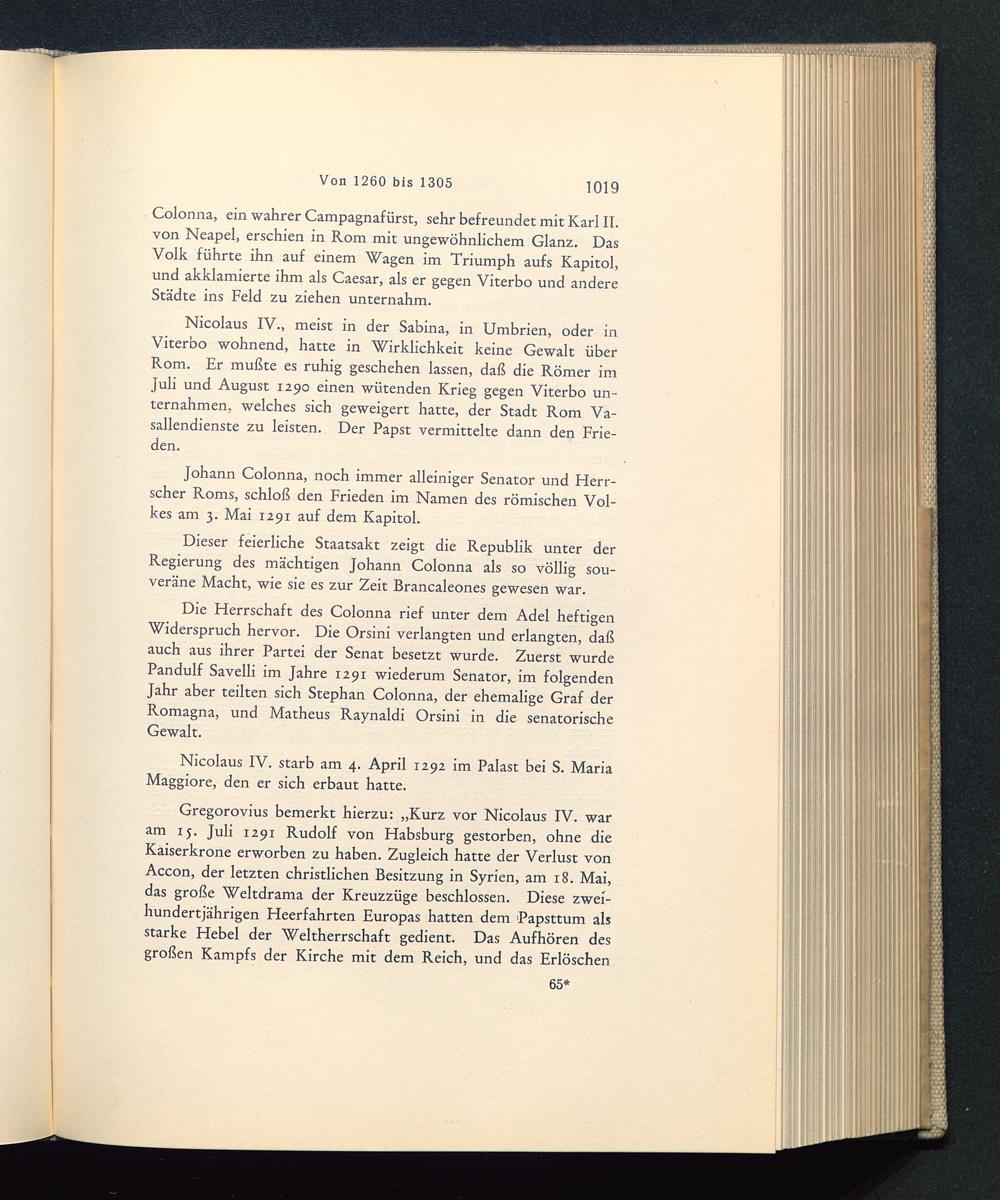 Gregorovius bemerkt hierzu: „Kurz vor Nicolaus IV. waram ij. Juli 1291 Rudolf von Habsburg gestorben, ohne dieKaiserkrone erworben zu haben. Zugleich hatte der Verlust vonAccon, der letzten christlichen Besitzung in Syrien, am 18. Mai,das große Weltdrama der Kreuzzüge beschlossen. Diese zwei-hundertjährigen Heerfahrten Europas hatten dem Papsttum alsstarke Hebel der Weltherrschaft gedient. Das Auf hören desgroßen Kampfs der Kirche mit dem Reich, und das Erlöschen