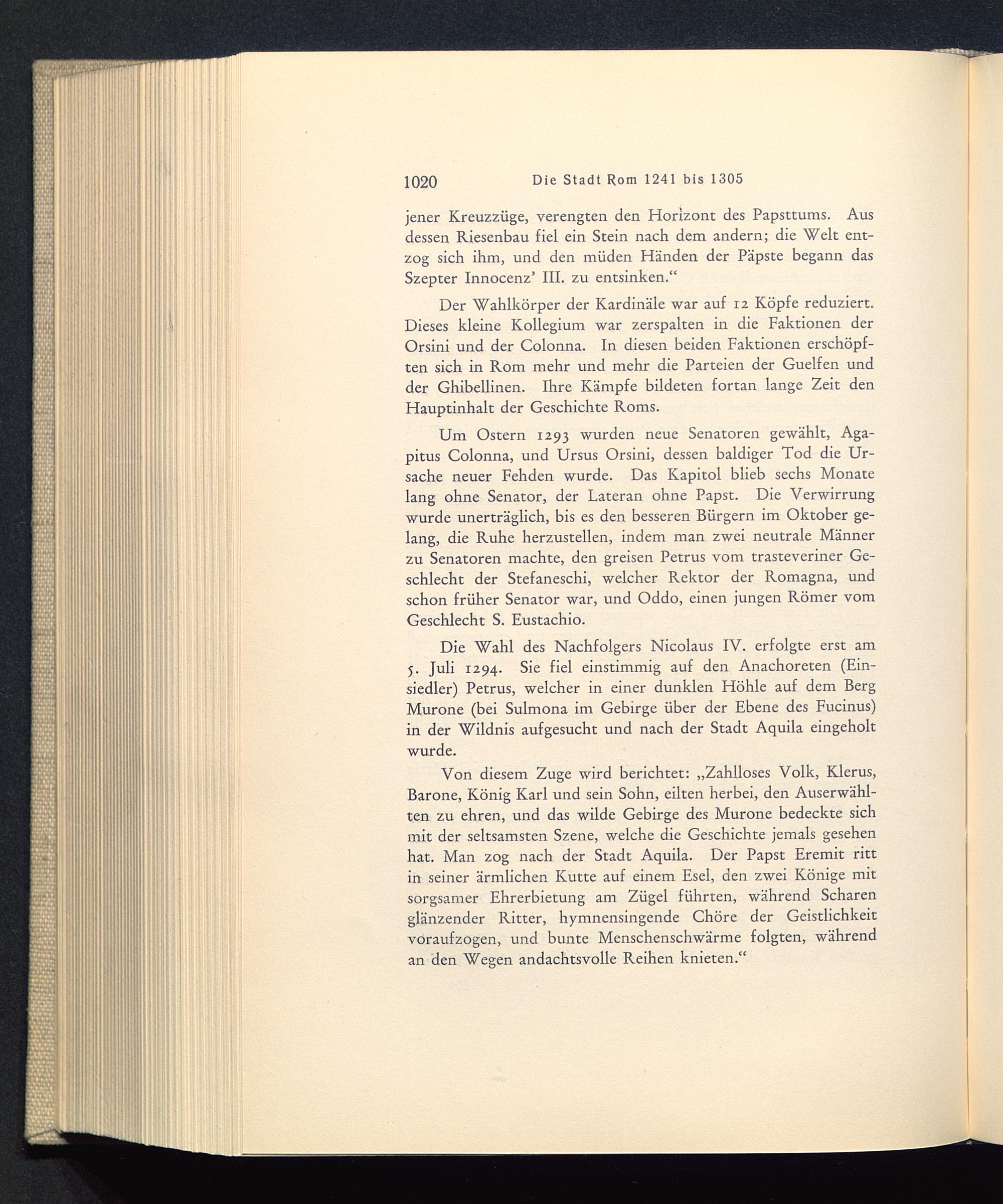 Der Wahlkörper der Kardinäle war auf 12 Köpfe reduziert.Dieses kleine Kollegium war zerspalten in die Faktionen derOrsini und der Colonna. In diesen beiden Faktionen erschöpf-ten sich in Rom mehr und mehr die Parteien der Guelfen undder Ghibellinen. Ihre Kämpfe bildeten fortan lange Zeit denHauptinhalt der Geschichte Roms.