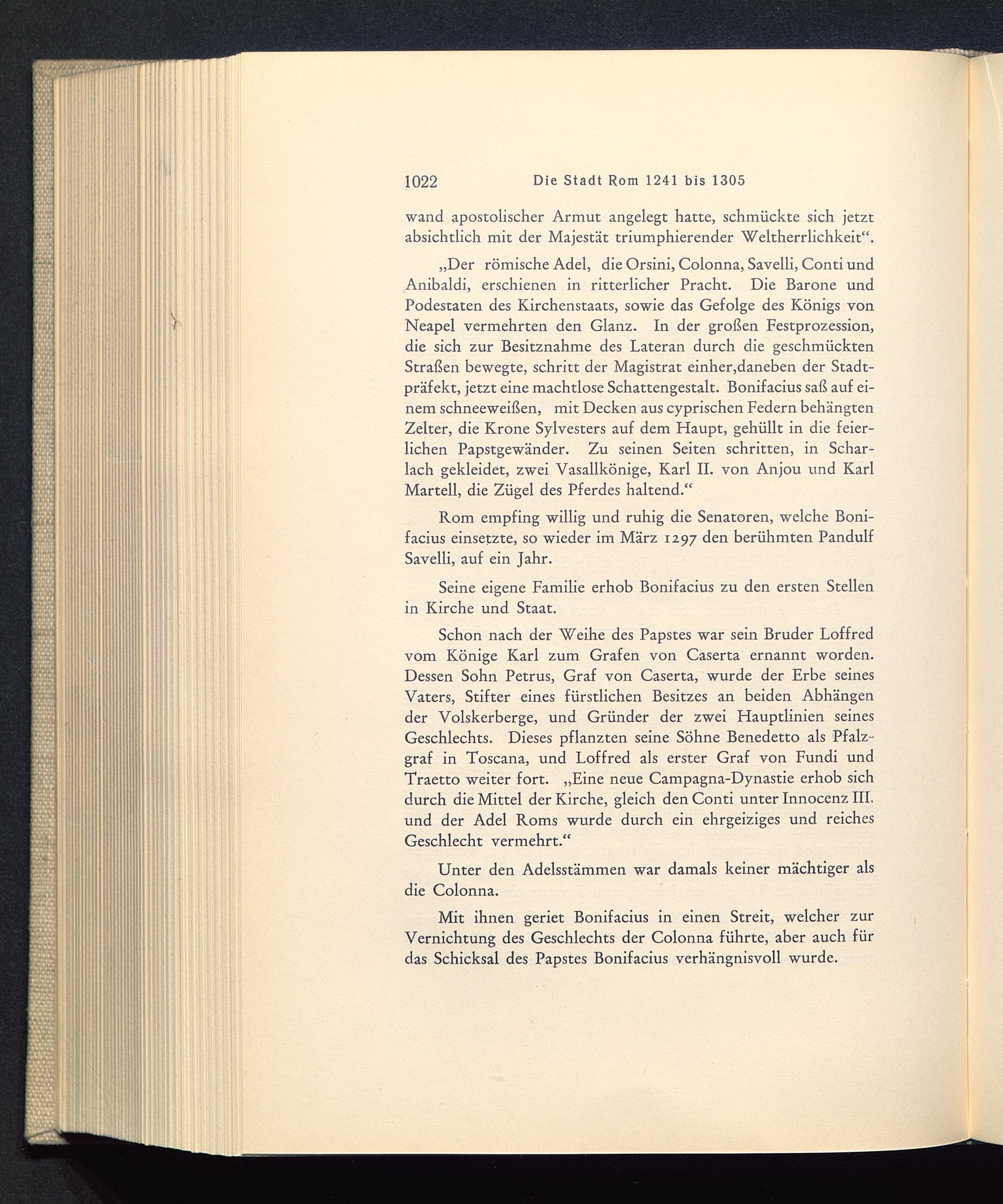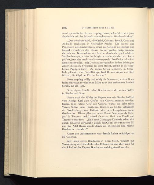 „Der römische Adel, die Orsini, Colonna, Savelli, Conti undAnibaldi, erschienen in ritterlicher Pracht. Die Barone undPodestaten des Kirchenstaats, sowie das Gefolge des Königs vonNeapel vermehrten den Glanz. In der großen Festprozession,die sich zur Besitznahme des Lateran durch die geschmücktenStraßen bewegte, schritt der Magistrat einher,daneben der Stadt-präfekt, jetzt eine machtlose Schattengestalt. Bonifacius saß auf ei-nem schneeweißen, mit Decken aus cyprischen Federn behängtenZelter, die Krone Sylvesters auf dem Flaupt, gehüllt in die feier-lichen Papstgewänder. Zu seinen Seiten schritten, in Schar-lach gekleidet, zwei Vasallkönige, Karl II. von Anjou und KarlMartell , die Zügel des Pferdes haltend.“