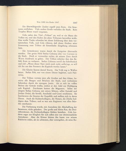 Cola nahm den Titel „Tribun“ an, weil er ein Mann desVolkes sei, und den Ruhm des alten Tribunats herstellen wolle.Eine weiße Taube schwebte bei dieser Erklärung über dem ver-sammelten Volk, und Cola rühmte, daß dieses Zeichen seineErnennung zum Tribun als himmlische Eingebung erkennenlasse.