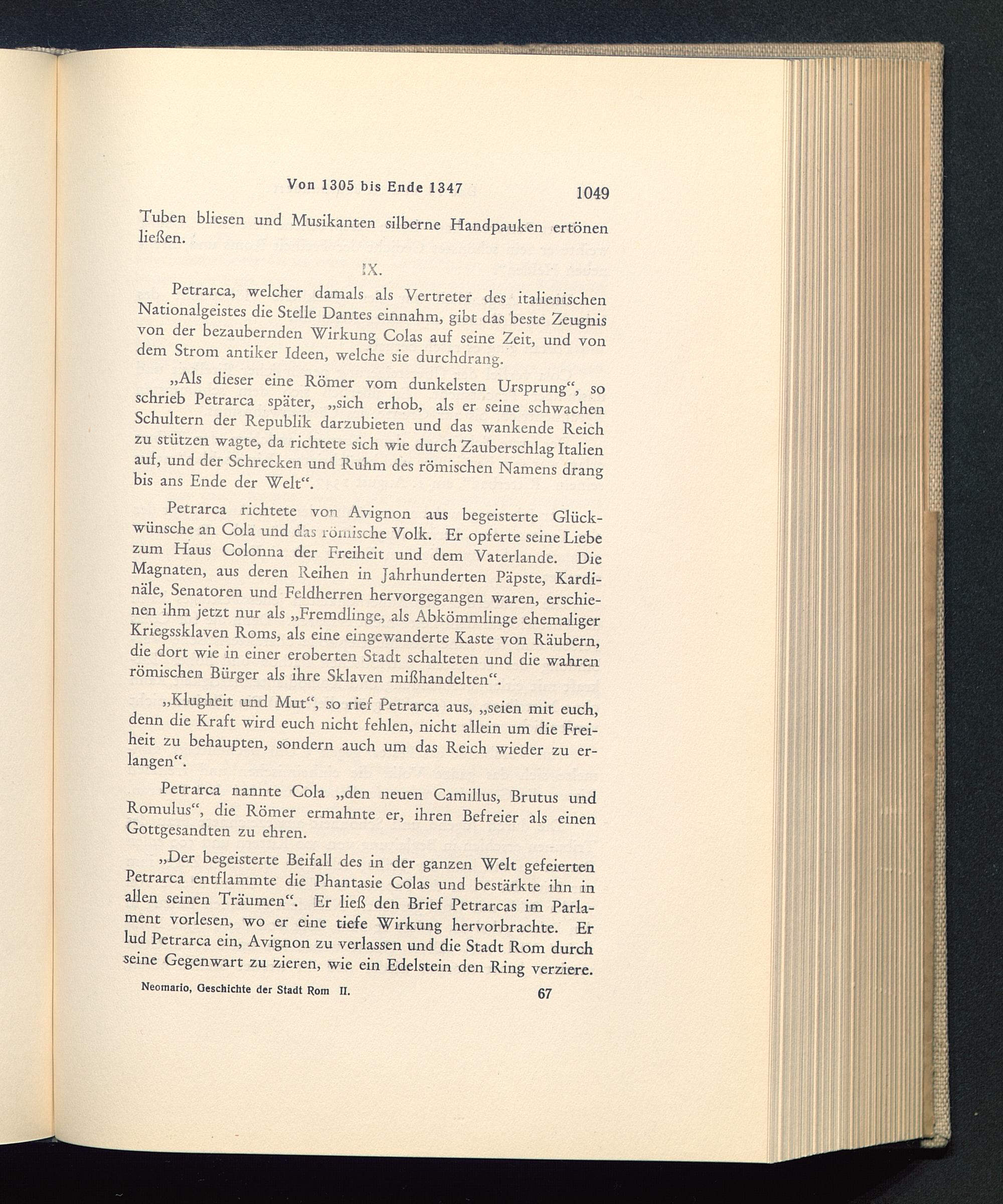 Petrarca, welcher damals als Vertreter des italienischen Nationalgeistes die Stelle Dantes einnahm, gibt das beste Zeugnisvon der bezaubernden Wirkung Colas auf seine Zeit, und vondem Strom antiker Ideen, welche sie durchdrang.