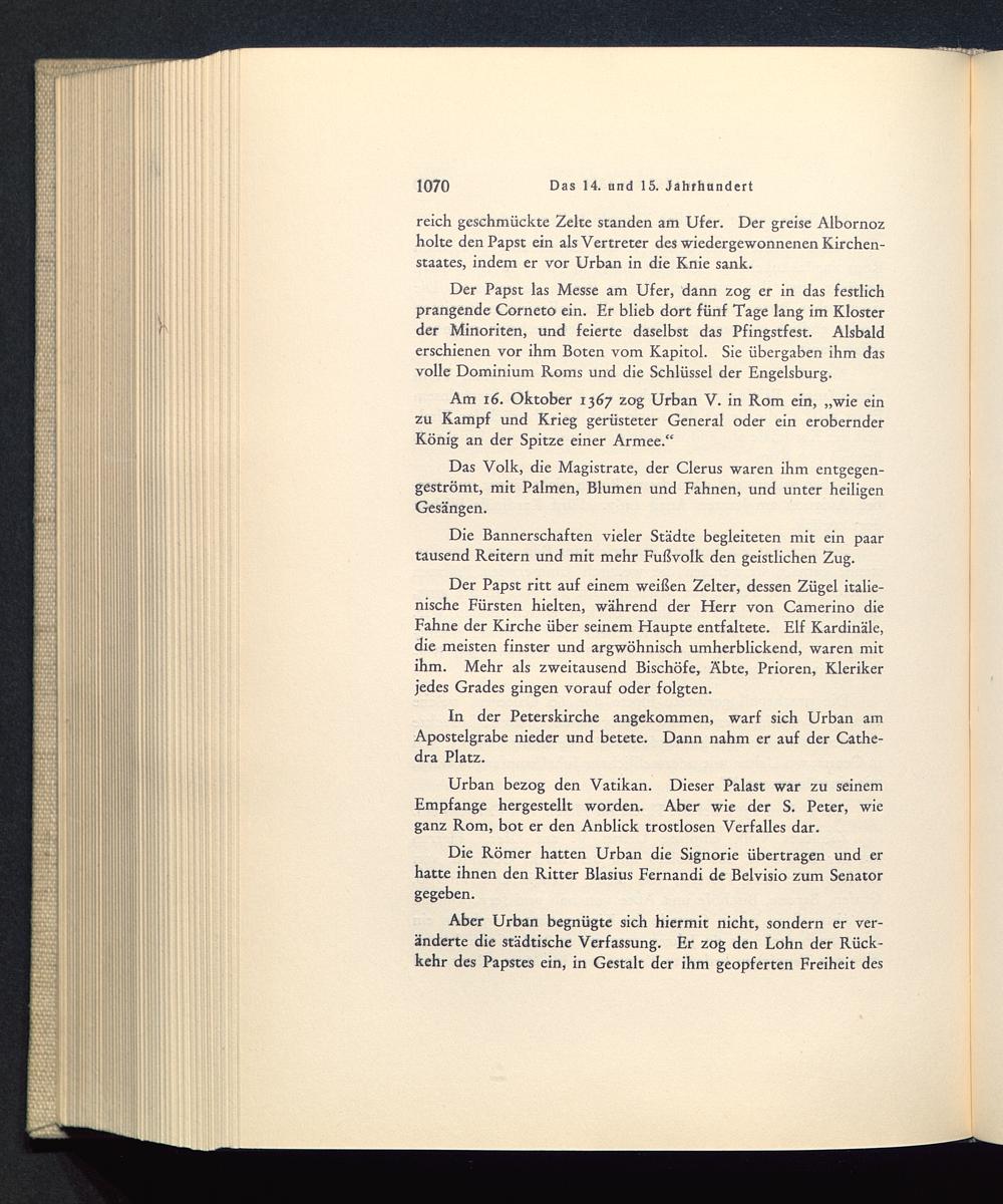 Am 16. Oktober 1367 zog Urban V. in Rom ein, „wie einzu Kampf und Krieg gerüsteter General oder ein erobernderKönig an der Spitze einer Armee.“