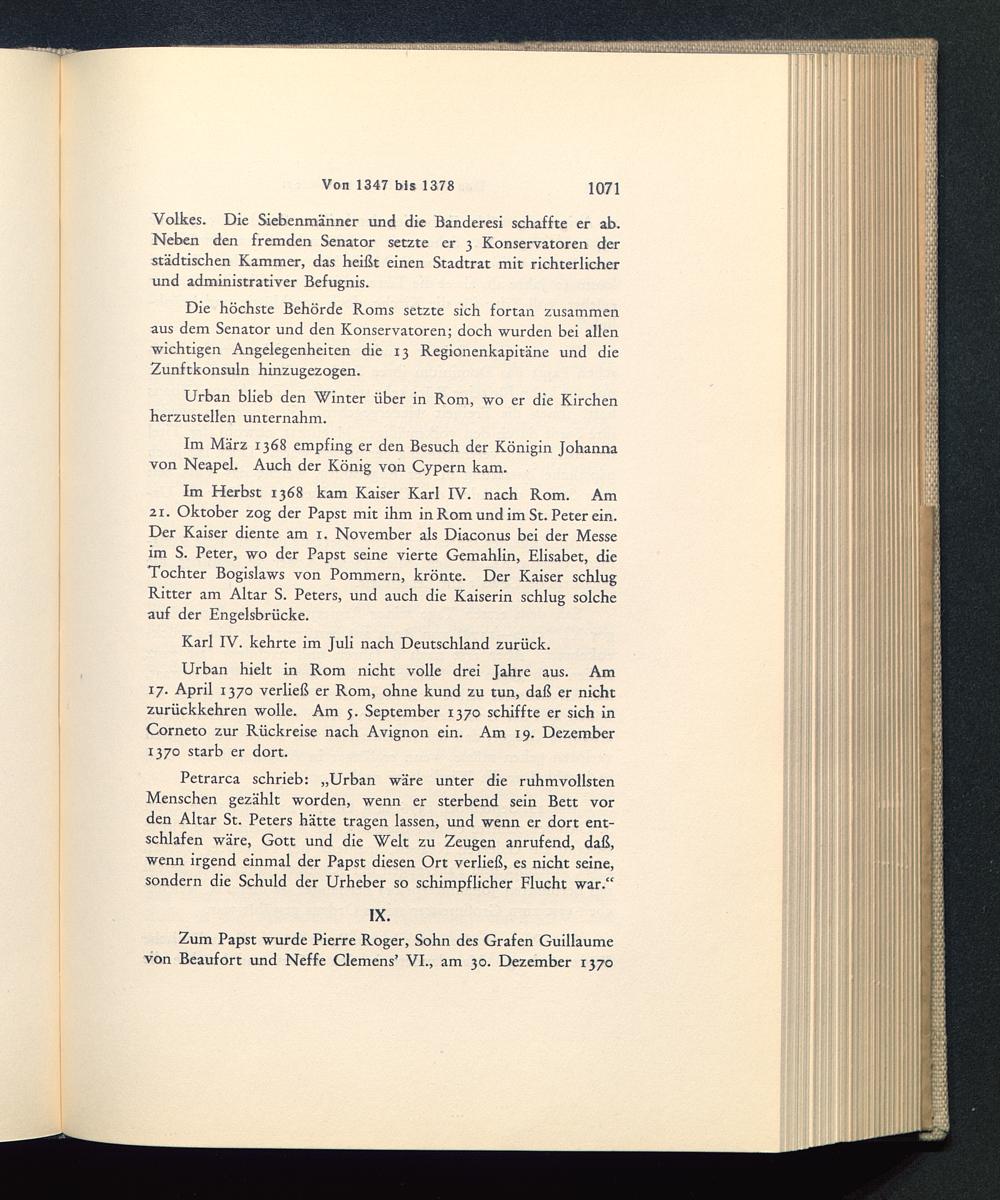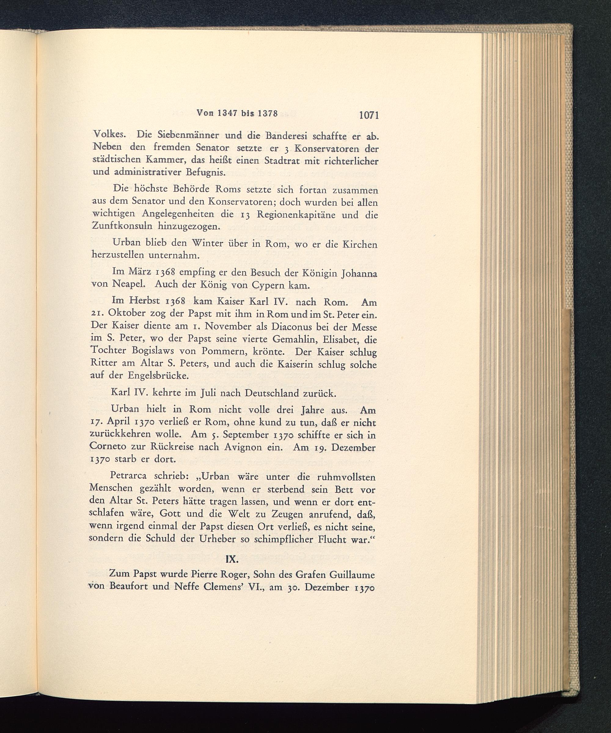 Petrarca schrieb: „Urban wäre unter die ruhmvollstenMenschen gezählt worden, wenn er sterbend sein Bett vorden Altar St. Peters hätte tragen lassen, und wenn er dort ent-schlafen wäre, Gott und die Welt zu Zeugen anrufend, daß,wenn irgend einmal der Papst diesen Ort verließ, es nicht seine,sondern die Schuld der Urheber so schimpflicher Flucht war.“