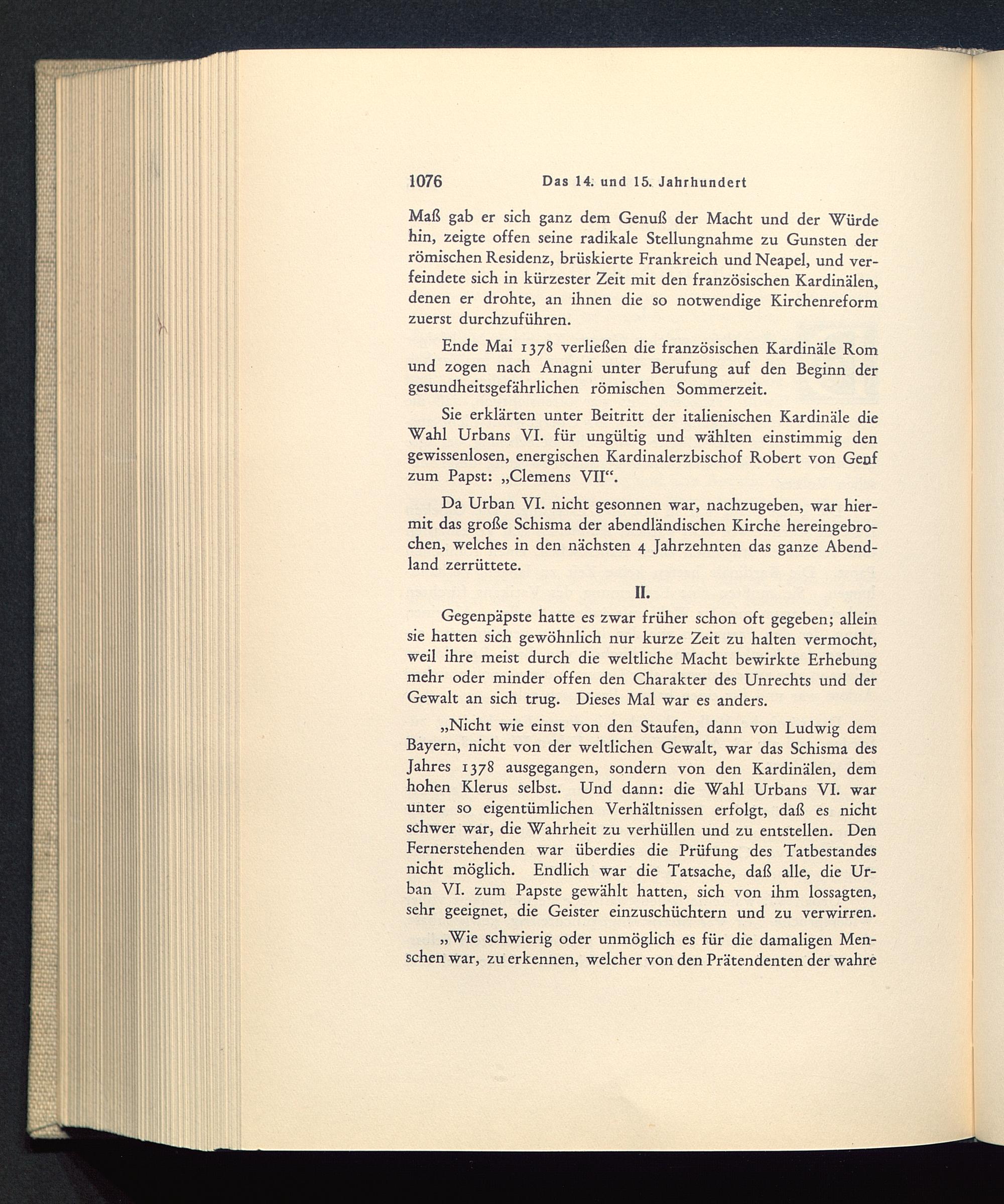 „Nicht wie einst von den Staufen , dann von Ludwig demBayern, nicht von der weltlichen Gewalt, war das Schisma desJahres 1378 ausgegangen, sondern von den Kardinälen, demhohen Klerus selbst. Und dann: die Wahl Urbans VI. warunter so eigentümlichen Verhältnissen erfolgt, daß es nichtschwer war, die Wahrheit zu verhüllen und zu entstellen. DenFernerstehenden war überdies die Prüfung des Tatbestandesnicht möglich. Endlich war die Tatsache, daß alle, die Ur-ban VI. zum Papste gewählt hatten, sich von ihm lossagten,sehr geeignet, die Geister einzuschüchtern und zu verwirren.
